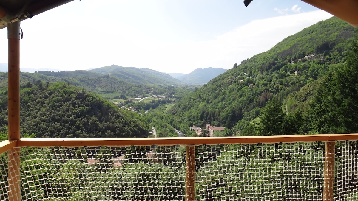 Alojamiento insólito con terraza suspendida que ofrece una magnífica vista de los Montes de Ardèche con todas las comodidades necesarias para pasar unas vacaciones estupendas. Una piscina climatizada de 4X14 tratada con sal con acceso las 24 horas para compartir con nosotros, abierta de mayo a octubre. Estamos a su disposición durante su estancia para organizar sus paseos, visitas, deporte (barranquismo, vía ferrata, ciclismo, escalada, senderismo...). Lodge alquilado solo por semanas en julio, agosto. No se admiten mascotas.