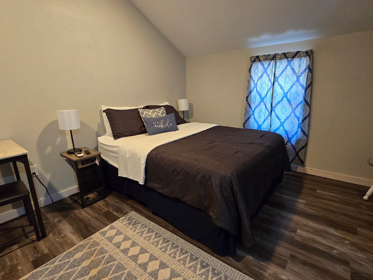 Rustic decor with high end touches. Open floor plan, kitchen is stocked with all essentials needed to cook your favorite meal Eating space at granite island, or in dining area. Quiet, Comfortable bedroom. Large utility with washer and dryer You will love the bathroom with the oversize shower. Enjoy grilling on the large deck. Flat screen TV in the living room and bedroom Gas fireplace in the living room