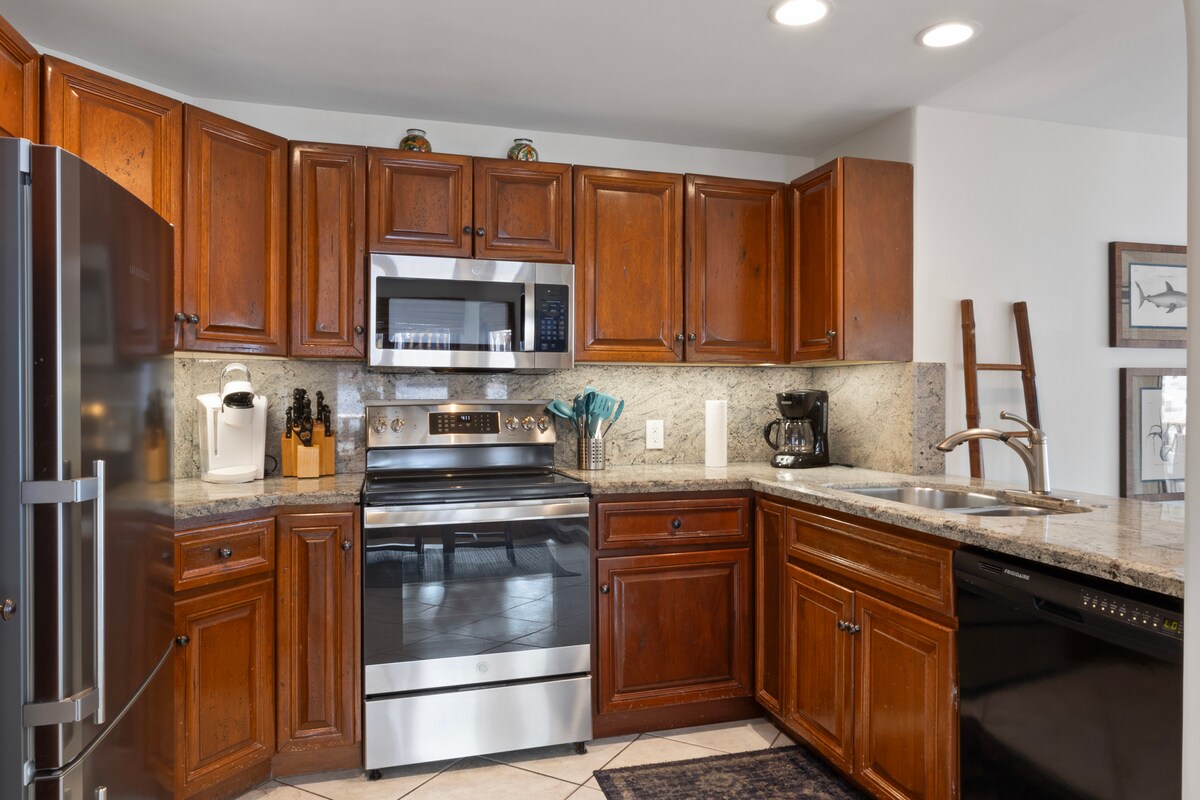 Un dormitorio totalmente remodelado con cama tamaño king. Espectacular vista al mar y un automóvil eléctrico de 4 plazas completamente nuevo. Una cocina totalmente equipada con electrodomésticos nuevos, cafetera Keurig con café incluido. Sofá cama tamaño queen en la sala de estar, chimenea y calentadores de pared. El balcón tiene una barbacoa. Servicios: Gimnasio, piscina climatizada, spa, campo de golf de 18 hoyos, canchas de tenis, cancha de croquet, voleibol de arena y playa con barbacoas y mesas de picnic. ¡Los ocupantes están sujetos a las reglas de la Asociación de Propietarios!