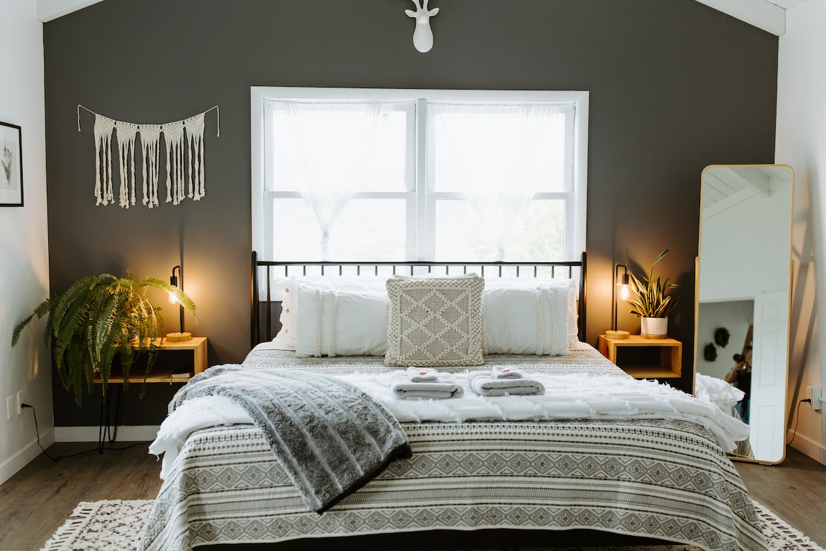 Con solo 200 pies cuadrados, nuestra pequeña casa de lujo aprovecha al máximo su espacio. Encontrarás una cocina de buen tamaño, una combinación de lavadora/secadora, un armario, una cama tamaño queen, servicios públicos de tamaño completo y una combinación única de ducha/bañera de inmersión japonesa. Hermosas vistas de amaneceres, montaña jorobada, alce banner y montaña de hayas. La cocina y la sala de estar cuentan con techos altos, pero *ten en cuenta* que la altura del techo del baño y del armario se reduce a unos 6 pies para dejar espacio para el dormitorio loft de arriba.
