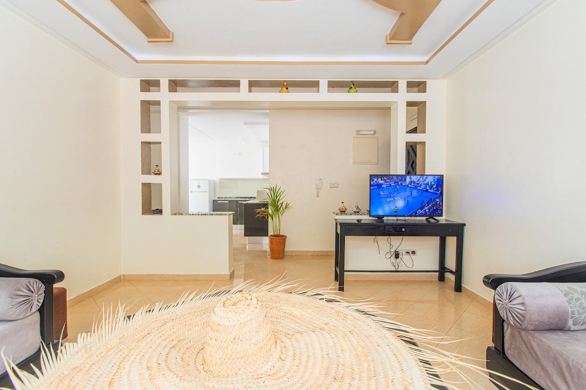 This one-bedroom apartment is perfect for solo travellers, couples, and surfers. The apartment is decorated with a minimalist style and features a spacious bedroom with a queen-size bed and ample storage space. The living room is bright and airy with 2 sofa beds, TV and kitchenette. The apartment is located in the heart of Tamraght, near "Hey Yallah Cafe" Walking distance from Devil's Rock, and a variety of shops, cafes & amenities