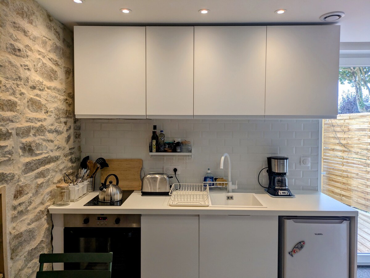 Relájese en este alojamiento tranquilo y decorado con cuidado. «Belles de Bretagne» le ofrece esta casa situada en el corazón del pueblo en un pequeño callejón, adosada a la de los propietarios. Tendrá todas las comodidades, se proporcionan sábanas y toallas Consta de una sala de estar abierta a una terraza de unos 20 m2, un dormitorio con cama de matrimonio de 160x200, cuarto de baño con ducha, aseo separado. Podrá aparcar de forma gratuita en las calles adyacentes.