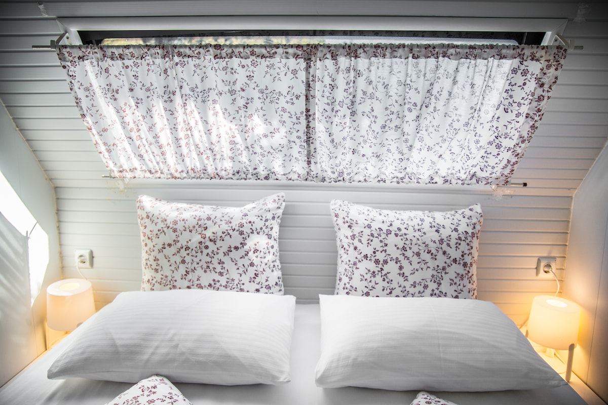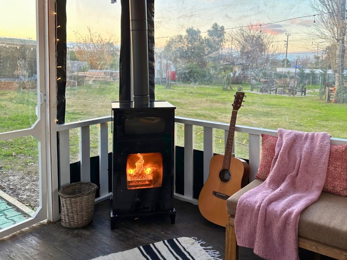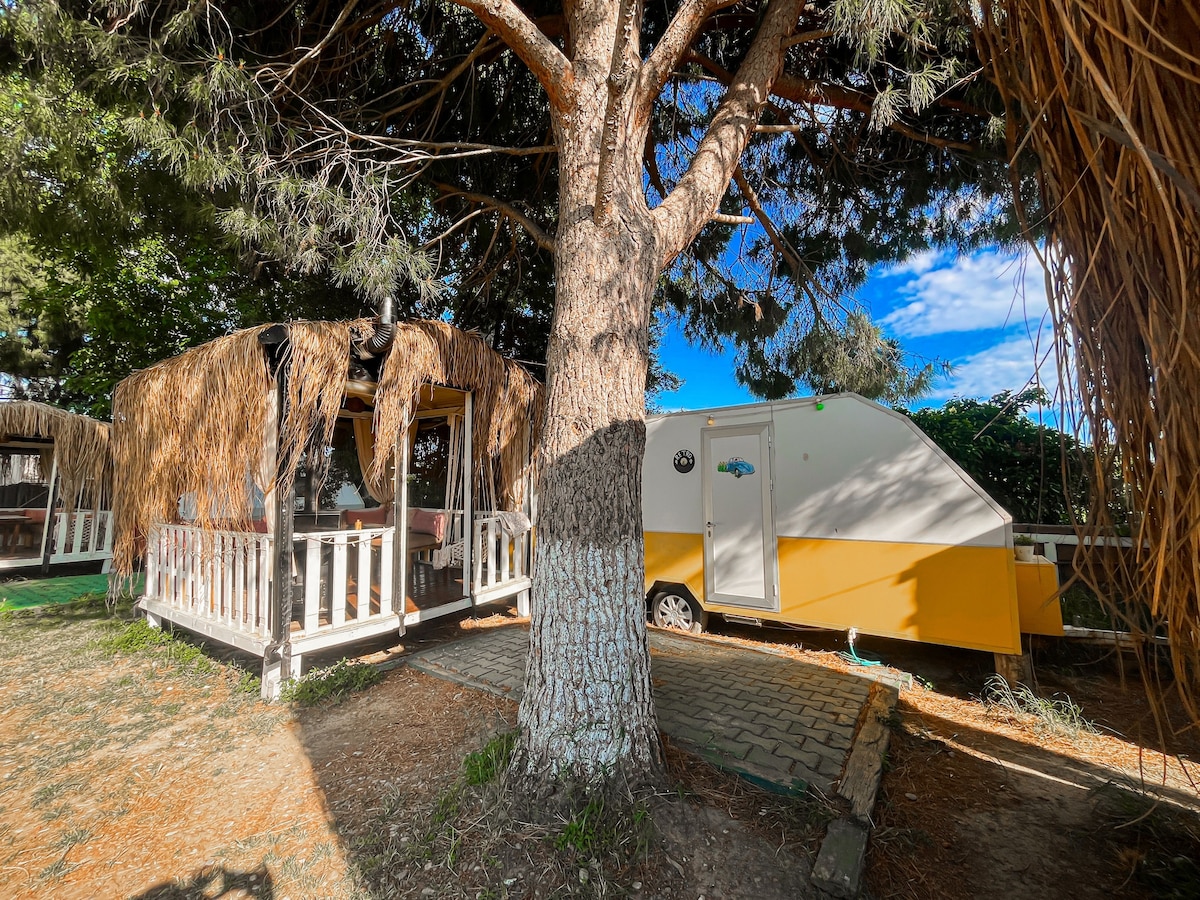 Casa rodante retro con terraza y chimenea jardín de invierno