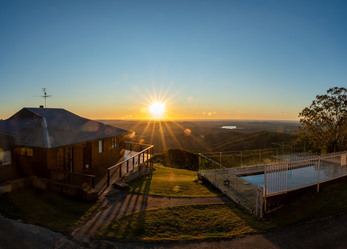 Ubicada en lo alto de una cresta privada de 3 acres con vistas panorámicas de 180 grados a la Sunshine Coast, esta casa de campo histórica, magníficamente renovada, combina el encanto rústico con el confort moderno. Despiértate con impresionantes amaneceres desde tu cama tamaño king y relájate junto a la chimenea de leña: esta es la escapada tranquila que tanto anhelabas. Ubicación ideal cerca de Maleny y Montville, con cafeterías y tiendas a solo unos minutos en auto. Un lugar perfecto para una escapada romántica ❤️.