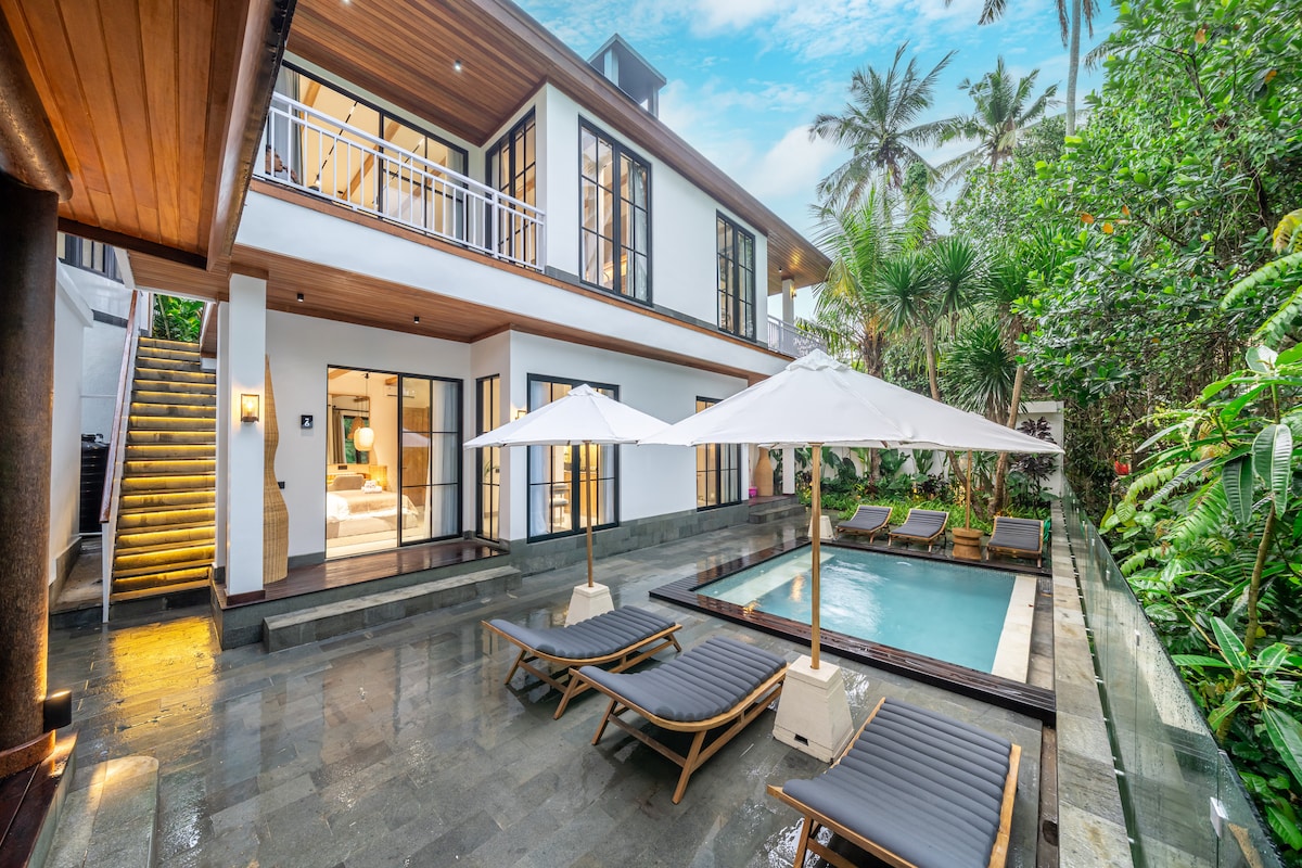 Piscina privada y vistas al campo de arroz • Elegante dormitorio con cama tamaño king y vistas al campo de arroz. • Baño privado con todas las comodidades, zapatillas y secador de pelo. • Cocina totalmente equipada para cocinar en casa. • Tu propia piscina privada + acceso a la piscina compartida de 3×8 m con tumbonas y sombrillas. • Gran cenador principal en el área común. • Wifi de 300 Mbps para trabajo y streaming. • Limpieza diaria con toallas y sábanas frescas • Servicio de conserjería para alquiler de scooters, reservas de spa y excursiones locales. • PS5, Netflix a petición
