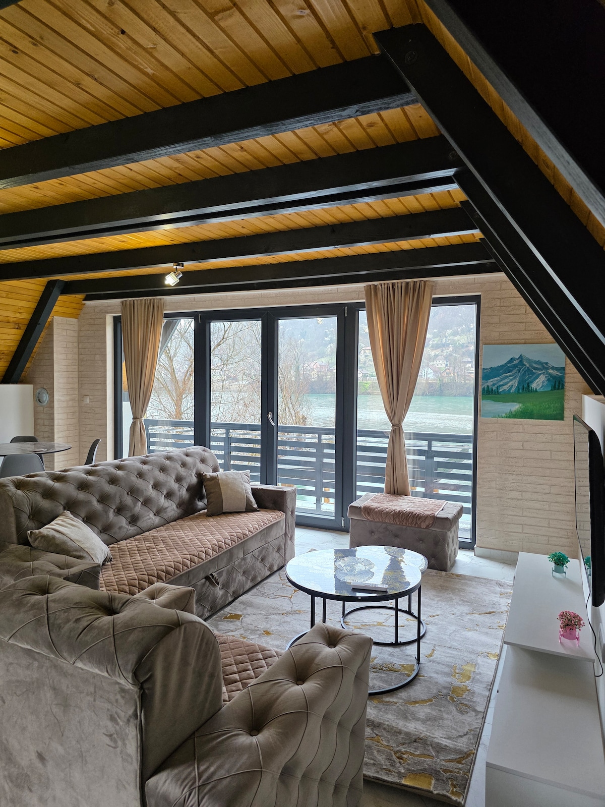 Villa Under the Stars is located right on the banks of the Drina River. Guests have access to a private swimming pool, a jacuzzi, and a sauna. The space is divided into two levels: The ground floor features a living room with a dining area, a fully equipped kitchen, a bathroom, and a closed terrace with a jacuzzi and sauna. The upper floor includes two bedrooms and a toilet. The house can accommodate up to 6 adults.