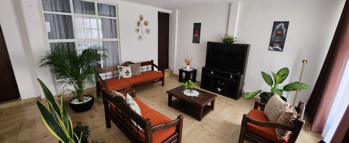 Amplio departamento con espacios llenos de luz y ventilación natural. Es un espacio pensado para 3 huéspedes (máximo). Sí eres estudiante universitario, vienes al estadio Azteca, o haces una visita turística a la zona de Coyoacán este lugar es ideal para ti. Cerca de CU, zona de hospitales y universidades del sur. Vías de transporte a menos de 10 minutos: metro CU y tren ligero. No contamos con estacionamiento privado, los huéspedes estacionan su coche en la calle frente al edificio.