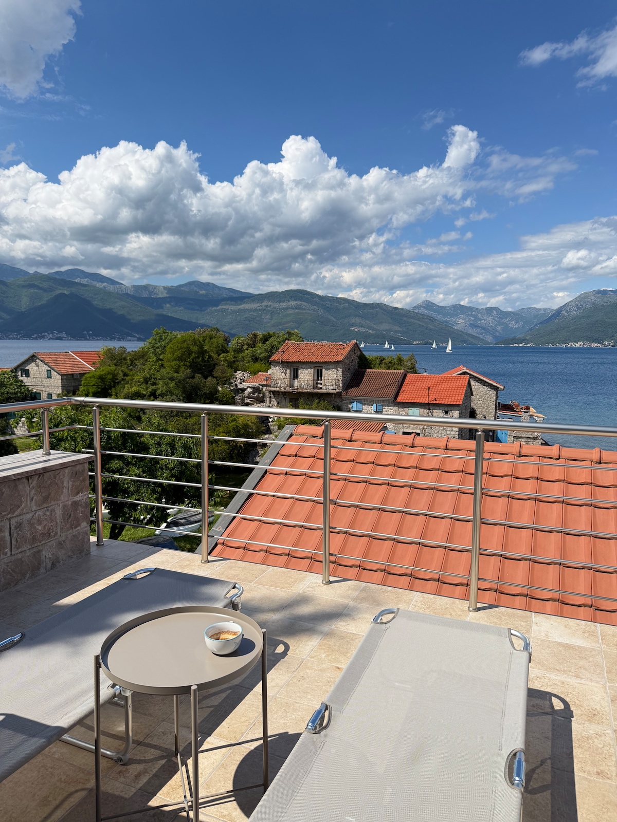 Este lugar único tiene un estilo propio. Ático soleado y panorámico que ofrece las vistas más espectaculares de la bahía de Boka. Puedes disfrutar de los impresionantes azules y verdes del mar y las montañas desde todas las habitaciones, ¡incluido el baño! Si quieres relajarte junto a la piscina compartida, disfrutar de tu aperitivo en tu gran terraza privada, o simplemente leer un gran libro junto a las ventanas, y aún así estar hipnotizado por la naturaleza, ¡este lugar es ideal para ti!