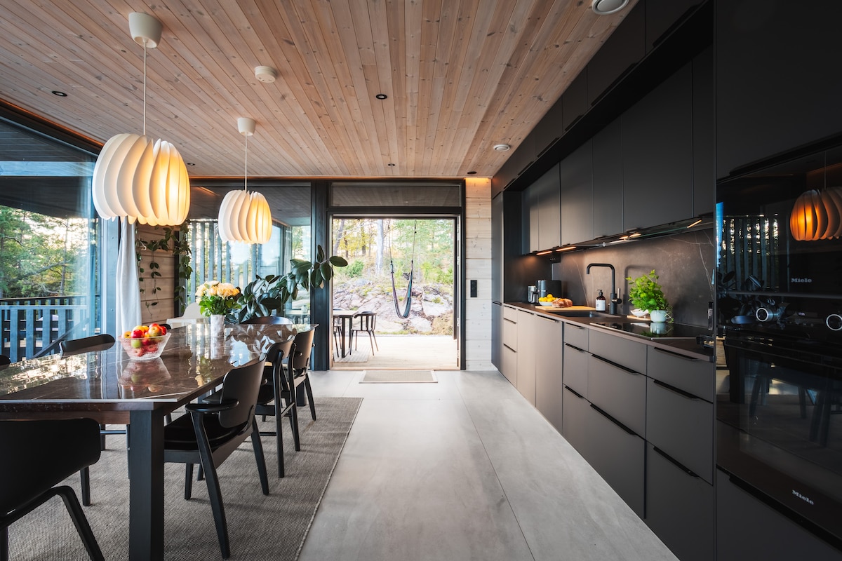 ¡Bienvenido a relajarte en una casa de campo moderna recién terminada con impresionantes vistas desde sus grandes ventanales sobre los campos! En el bosque alrededor de la cabaña, puedes ir de excursión, setas y recoger bayas, y en un kilómetro se encuentra el pintoresco lago Gölen. La cabaña se encuentra cerca de la herrería de Billnäs, y el Fiskars Village, con sus restaurantes y boutiques, también está a poca distancia en bicicleta. Una sauna tradicional de leña, de libre acceso para los inquilinos, ofrece vapor profundo y húmedo.