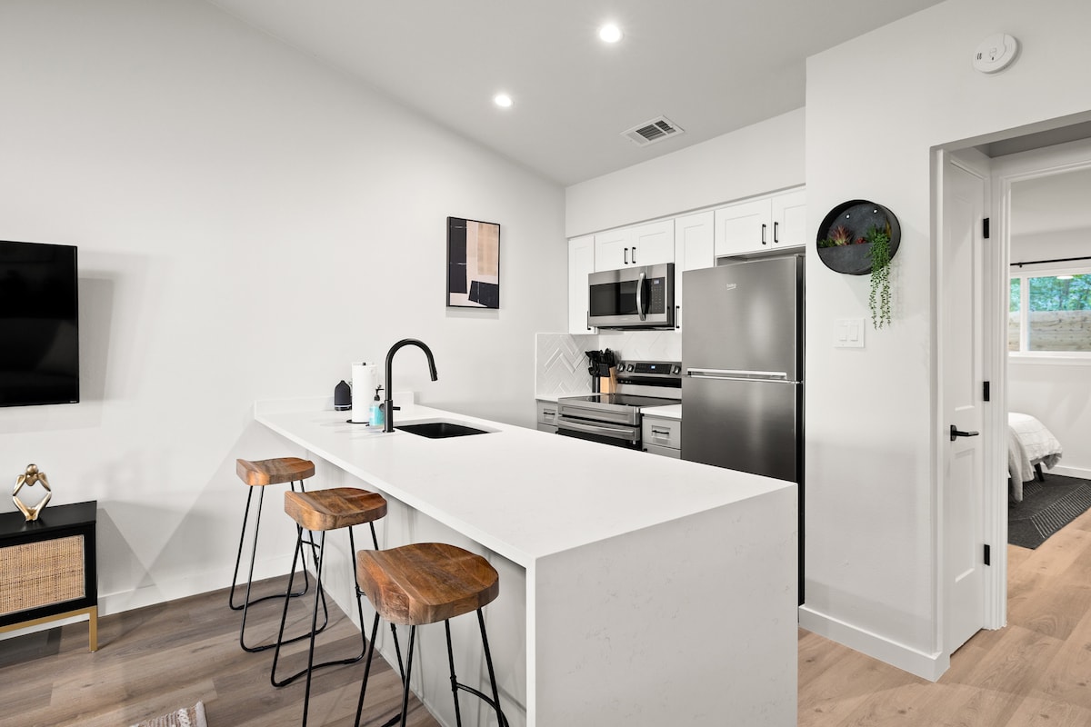 Una propiedad galardonada con un diseño arquitectónico en el corazón de Austin, con lujosos muebles de diseño, amplios dormitorios/baños (con bañera), techos altos, camas tamaño king/queen súper cómodas y un gran televisor con Netflix, HBO y Disney Plus. La propiedad está ubicada en la mejor y más segura zona de Austin. Está a 5 minutos en Uber/Lyft del centro de la ciudad, a 10 minutos a pie de Barton Springs y Zilker Park, y tiene una tienda de comestibles justo al lado. Este es un AirBnB legal (licencia #OL2021201540).