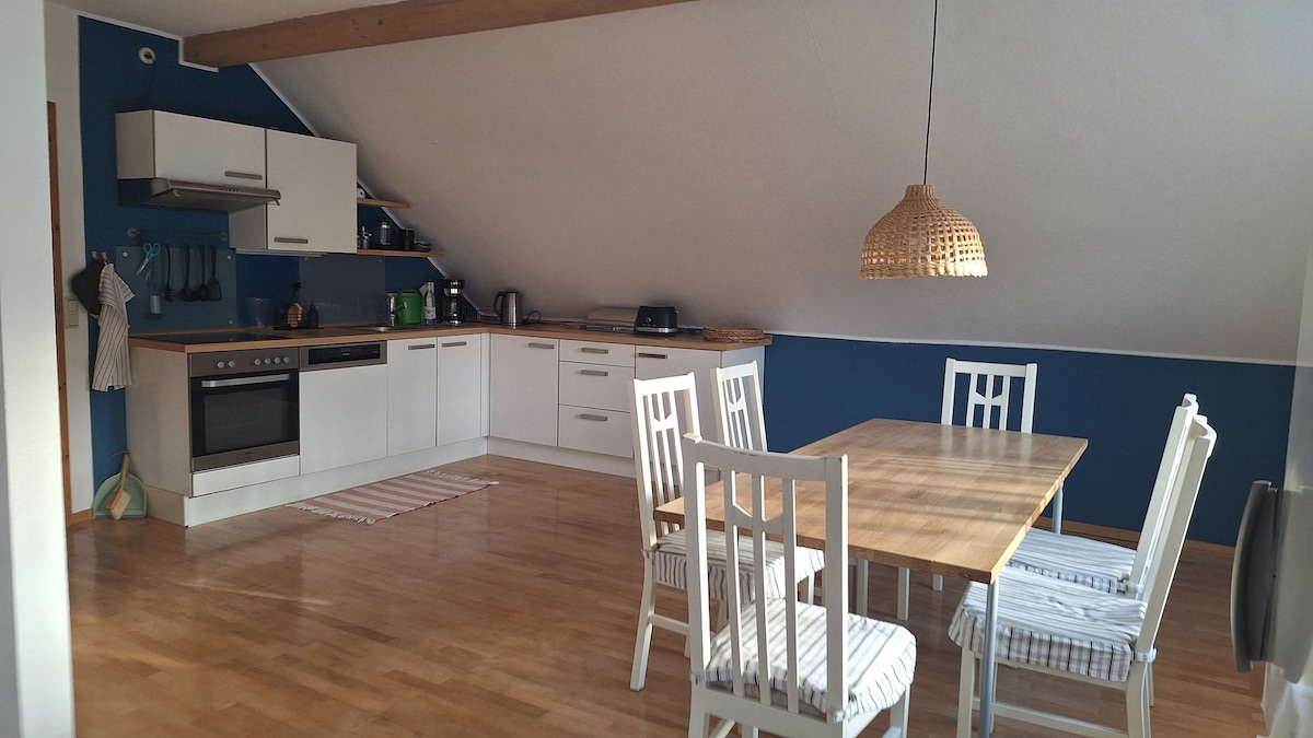 Este acogedor apartamento de unos 37 metros cuadrados ha sido renovado con mucho amor y muchos materiales de construcción naturales, para que no se pierda el encanto que una casa tan antigua puede desprender. Ofrece a los huéspedes un ambiente muy acogedor en un jardín paradisíaco idílico. Hay plazas de aparcamiento gratuitas disponibles para los huéspedes justo delante de la casa. También se pueden alquilar bicicletas. Varias tiendas se encuentran en las inmediaciones y se puede llegar a pie.