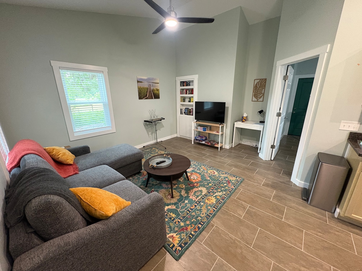 Esta suite de invitados consta de un dormitorio (cama tamaño king) y un baño completo. La entrada privada se encuentra en el porche delantero y el espacio está separado del resto de la casa. El espacio no incluye sala de estar ni cocina, pero hay una nevera pequeña, microondas, cafetera, zona de estar cómoda y un gran porche para relajarse. También hay un purificador de aire en la habitación, con filtración HEPA, que elimina el 99,9 de todas las partículas del aire. El espacio es del tamaño de una habitación de hotel promedio.