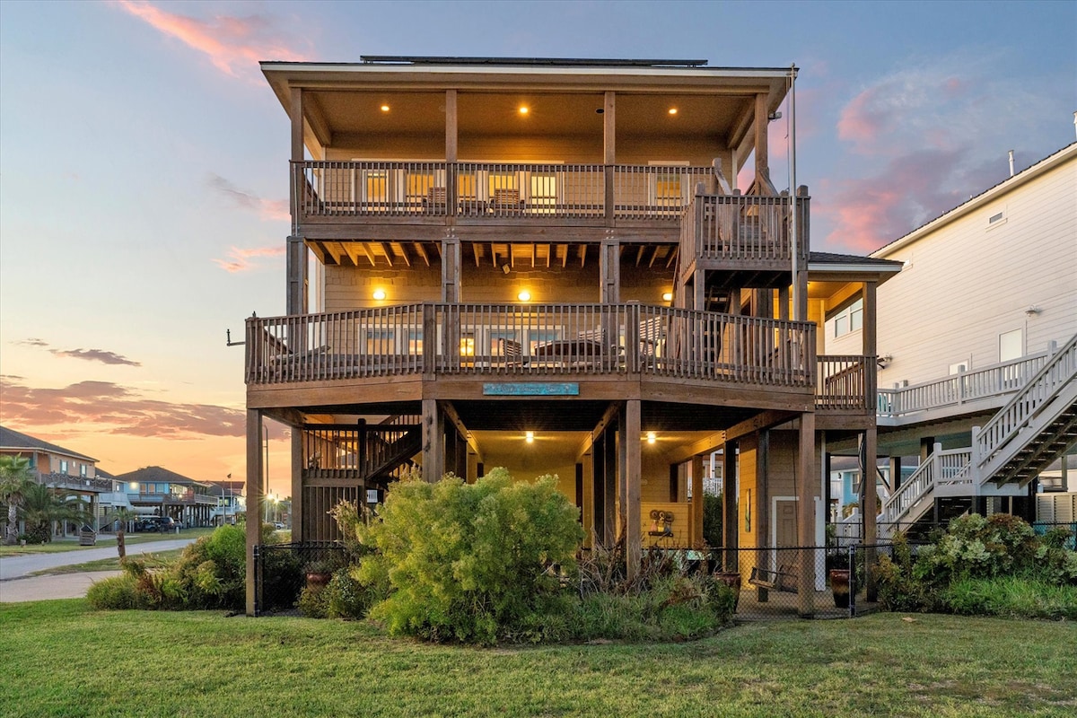 Come away to this amazing beach house in Crystal Beach with water views and walking distance to the beach. Outside, the property is all about lounging and entertainment, with a fire pit, hammocks, shady porches, sweeping balconies, a weber grill, and a ping pong table. Inside, you'll find 4 gorgeous bedrooms with a bonus kid-friendly sleeping nook, a spacious living area with fire place, and a well-stocked kitchen, perfect for families, friends, or couples. 5 min walk to the Beach