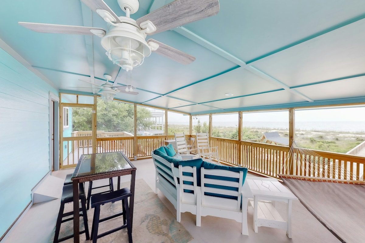 ¡Increíble propiedad recién remodelada frente a la playa! Esta gran casa de 5 dormitorios es el refugio perfecto. Ubicada justo sobre la playa, la puerta trasera se abre a una gran terraza con parrilla y tumbonas para relajarte y observar a los delfines en el océano (¡hay mucho!) Hay un porche de Carolina de 500 pies cuadrados si prefieres quedarte en el interior y aún así tener hermosas vistas panorámicas al mar. El alojamiento tiene 5 dormitorios grandes y tiene capacidad para 19 personas. ¡Cocina completamente surtida!