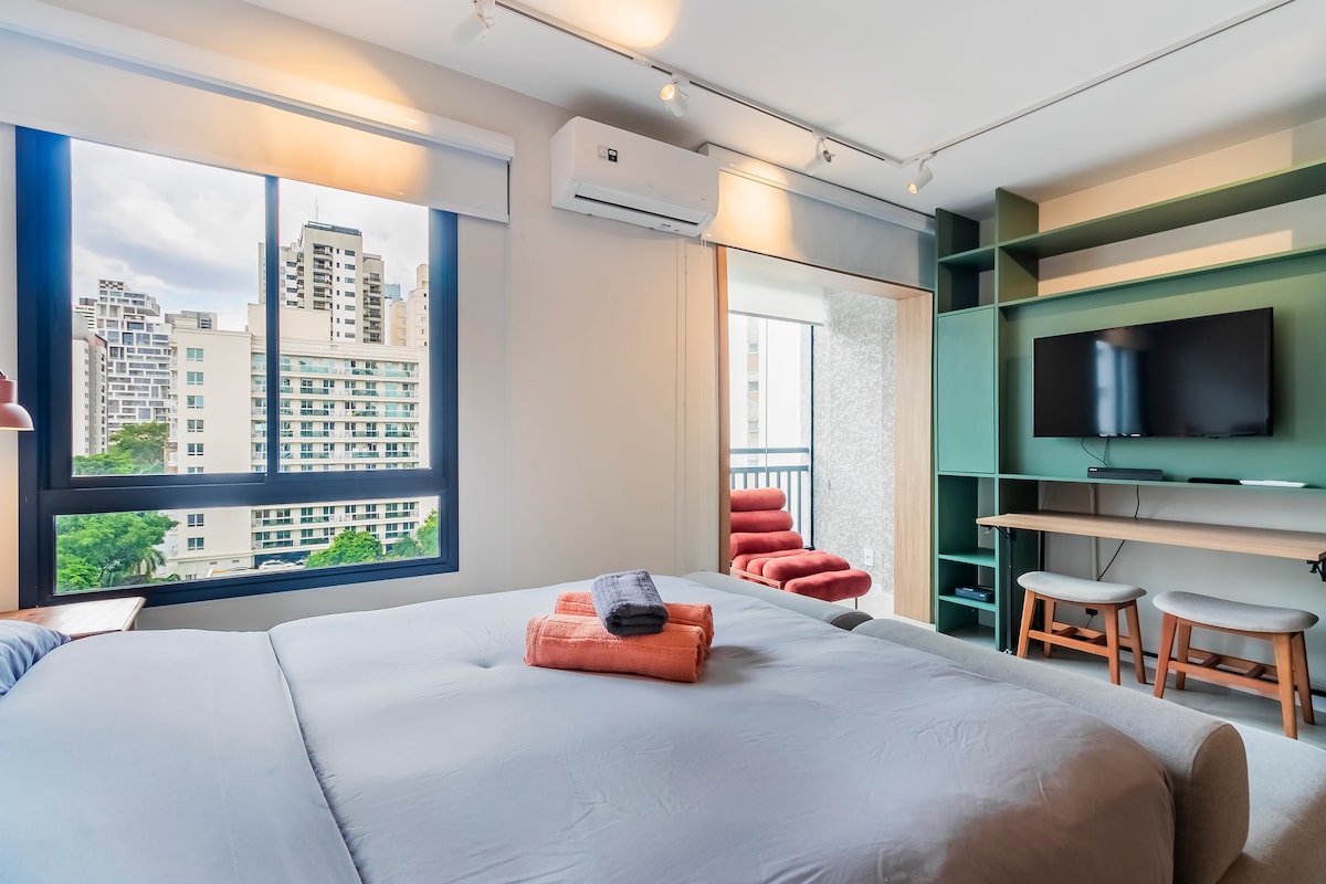Disfruta de la bohemia y artística Vila Madalena, llena de bares, restaurantes y cafeterías. Puedes conocer la región o incluso hacer un recorrido por los parques de la ciudad con una bicicleta, disponible de forma gratuita. ¿Vendrás a trabajar? Concéntrate en ello en la cómoda mesa frente al balcón verde con una hermosa vista a las copas de los árboles. Después de todo, disfruta del gimnasio, la piscina, la sauna y la sala de billar para tu ocio completo.