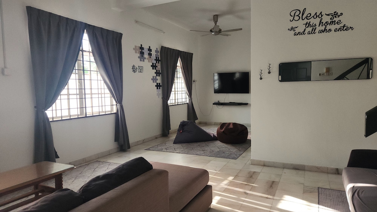 3 Bedrooms Semi D Single Storey House 🛏 Master room: Queen bed attached bathroom + 2 Sejadah ( praying matt ) 🛏 Room 2: Queen bed 🛏Room 3: Super Single bed (Room 2 & 3 share bathroom) 👨👩👧 Comfort for 5, max 8 person 🛋️ Extra floor mattress available upon request (additional charge applies) ❄️ Air-Con in all bedroom + living and dining area 📶 Free Wi-Fi 🍳 Kitchen: fridge, induction cooker, bread toaster, water filter (hot/cold), rice cooker, hair dryer, iron and board