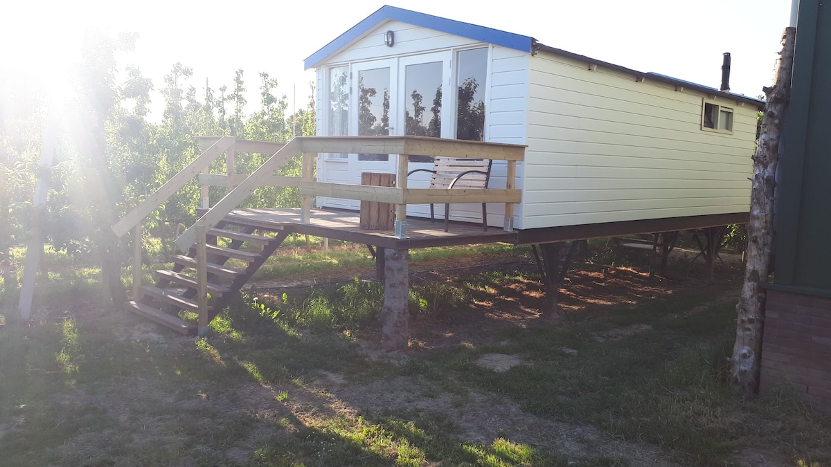 Bonita casa de campo independiente con vistas a los huertos de manzanas y peras en el jardín frutal de los Países Bajos: el Betuwe. Estudio con dos camas y, opcionalmente, una cama supletoria en el sofá cama. Cocina con nevera, placa de inducción de 2 fuegos, cafetera y hervidor de agua. Baño separado con lavabo, ducha y WC. A tiro de piedra del río Waal y sus llanuras aluviales, en medio del triángulo de las ciudades de Arnhem, Nimega y Tiel. A 5 minutos de la A15. Cuna y trona disponibles.