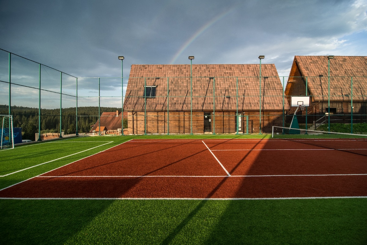 La cabaña se completó en 2023 y ofrecemos: -7 dormitorios con cama matrimonial. - 6 baños. - Vive espacioso de 73 m2. - Vistas panorámicas. - Cocina totalmente equipada. -farmer - Aparcamiento. - Televisión y acceso a Internet. - Posibilidad de servir comidas a través de servicios de catering. La casa se encuentra en una zona tranquila, a solo 2 km del lago Belis. Tiene un patio generoso.