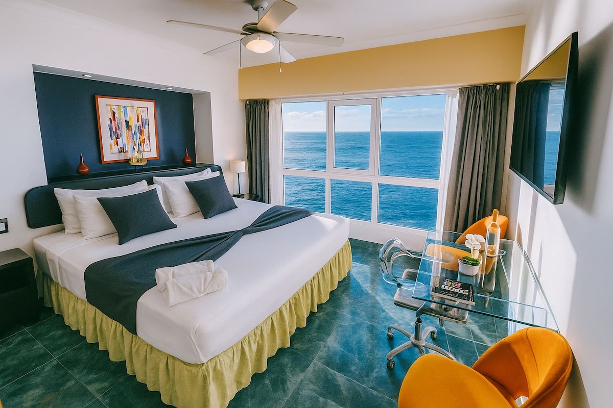 Moderno apartamento totalmente reformado en el 6.º nivel, con sala ( VISTA A LA CIUDAD ) y dormitorio cama KING ( VISTA AL MAR CARIBE ) . Dispone de estacionamiento privado, wifi fibra Claro, TV, aire acondicionado, shutters eléctricos y decoración actual. Ubicado en la mejor zona del Malecón, cerca de restaurantes y ocio. Ideal para vacaciones, trabajo o nómada digital. Estacionamiento privado, seguridad 24 horas, ascensor y planta eléctrica. A 10 min en Uber de la Zona Colonial.