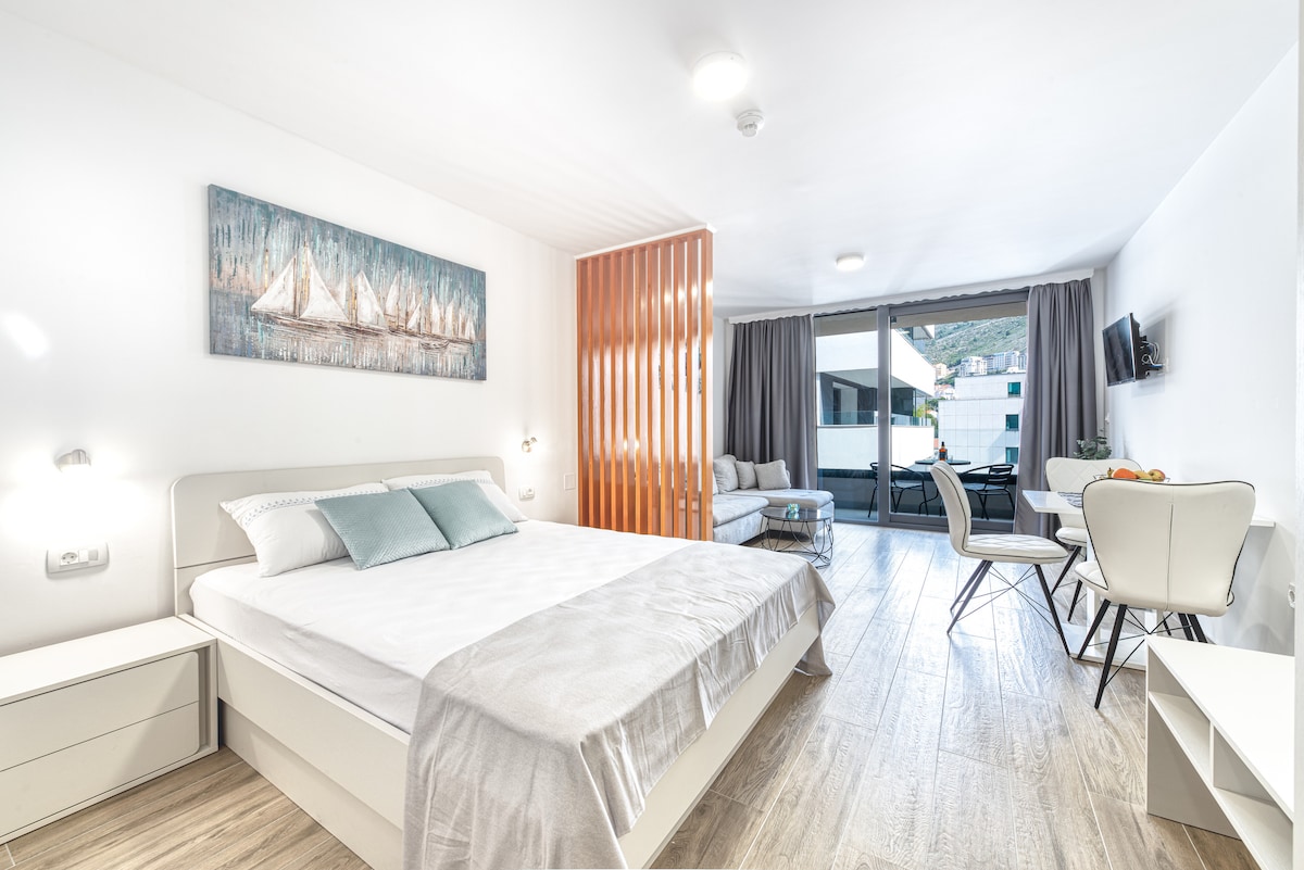 Nuevo estudio elegante con estacionamiento ubicado en el centro de una ciudad. Popular paseo marítimo de Lapad ubicado a 10 minutos a pie. Estación de autobuses ubicada a solo 1 minuto a pie.