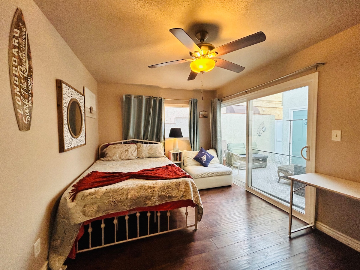 Kick back and relax in this calm, quiet oceanfront stylish studio on the Long Beach peninsula. Lots of restaurants and shopping close by. Walk on the sand and collect shells, take a relaxing stroll on the boardwalk, or to the pier, paddleboard or kayak in the bay, share a romantic gondola. Close to LAX, John Wayne and Long Beach airports, Disneyland and Knotts Berry Farm, and more. Or just sit on the patio to relax and watch the kiteboarders and gorgeous sunsets, maybe you'll see a green flash.