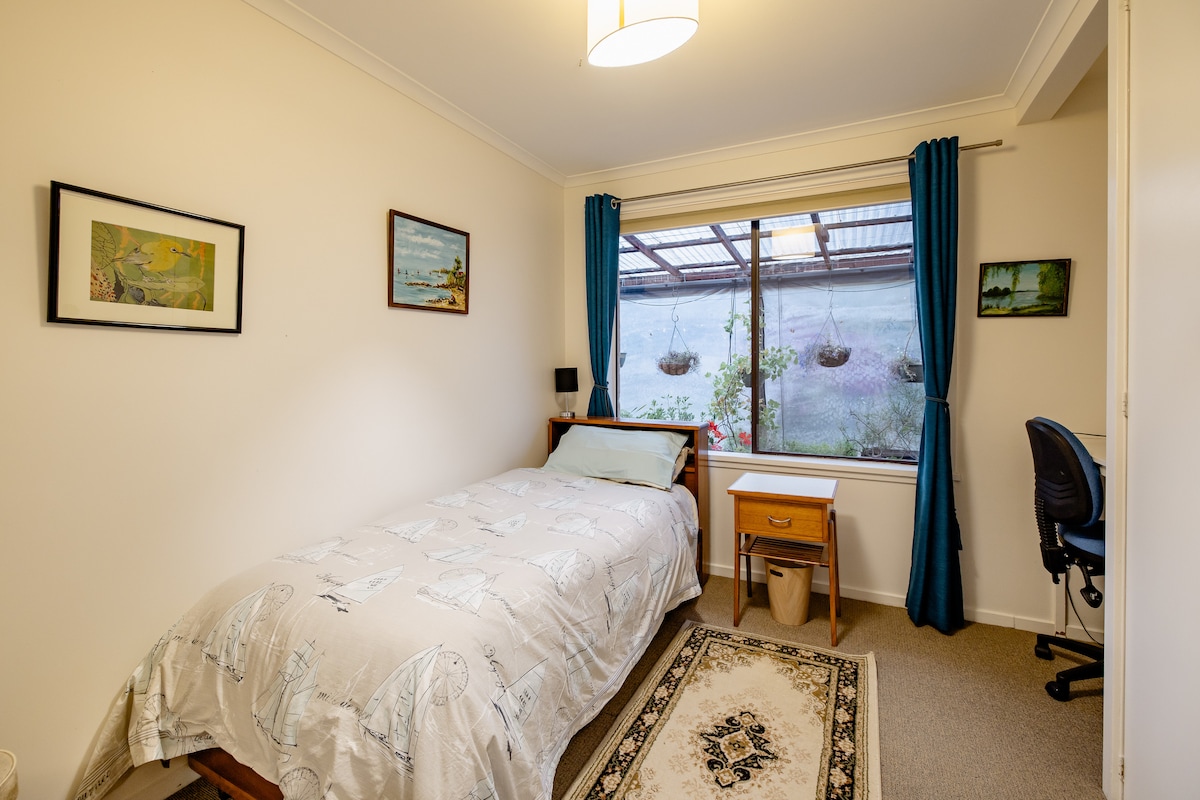 Private space (own entrance) connected to a newly constructed ecologically designed home in quiet treed neighbourhood 4km from the centre of Castlemaine. Queen bed, private bathroom, sitting room, fridge, toaster, tea and coffee making facilities. No cooking facilities but some utensils provided - cups, glasses, cutlery etc. (Price for single occupancy second guest fee added at booking. Not suitable for children or pets.)