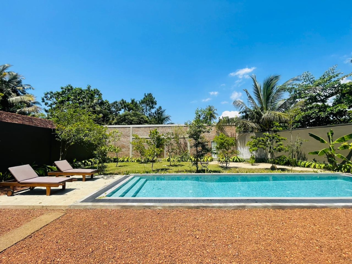 Una villa colonial cuidadosamente restaurada en un gran y tranquilo jardín privado lleno de naturaleza cerca de Ambalangoda. La villa tiene capacidad para 6 personas en 3 dormitorios con aire acondicionado, baños privados y camas con dosel: 2 dobles y una con 2 individuales. Wifi gratuito, agua filtrada y desayuno con frutas, huevos, tostadas y mermelada casera. El chef y el ama de llaves que vive en la casa de servicio cercana estarán disponibles para cuidarte y la terraza es ideal para relajarse y cenar con vistas a la piscina de 40 pies y el lago Madampe.