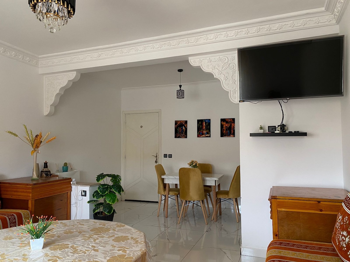 Bienvenido a nuestro moderno apartamento, a solo 20 km de Saïdia, a 80 km de Nador y a 50 km del aeropuerto de Oujda. Ubicado en el tercer piso con ascensor, cuenta con dos cómodas habitaciones, una luminosa sala de estar, una cocina totalmente equipada, un baño con ducha y baños separados. Hay wifi de alta velocidad, un espacio de almacenamiento y estacionamiento gratuito disponibles. Perfecto para familias, amigos o estadías de negocios. ¡Esperamos recibirte y ayudarte a aprovechar al máximo tu visita!