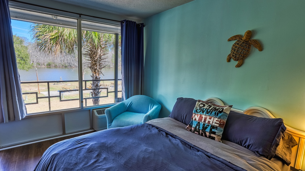 Despierta con vistas al agua de 180 grados y atardeceres en el lago Marion. Nuestra habitación de hotel remodelada frente al lago tiene vistas a nuestra cala privada y está a solo 15 minutos de la I-95. En el interior, relájate en una cómoda cama doble, transmite tus programas favoritos en un televisor inteligente de 50 pulgadas o sal a cenar a nuestro restaurante en el lugar. La habitación tiene capacidad para cuatro huéspedes, por lo que es ideal para parejas o familias. Ya sea que estés en un viaje por carretera o pasando un fin de semana en el agua, Bells Marina ofrece relajación junto al lago Marion con facilidad.