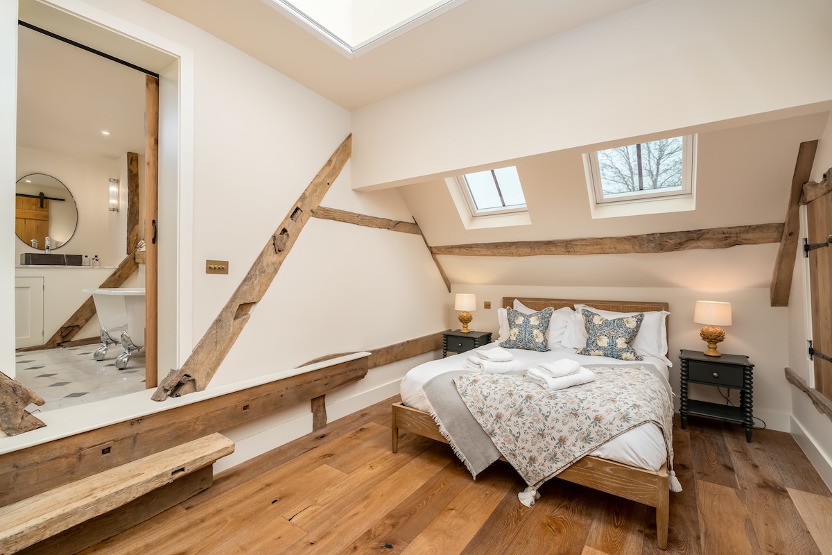 A country hideout above our detached oak framed barn. Stylishly furnished in a rustic luxury theme ensuring this retreat ticks all boxes to make your stay comfortable & cosy! Very spacious and an ideal place to come and relax for a romantic countryside break. Fantastic pub in the neighbouring village that serves food most days (please check) and there is a very well equipped kitchen should you like to cook for yourselves. Easy access to Oxfordshire best countryside walks too.
