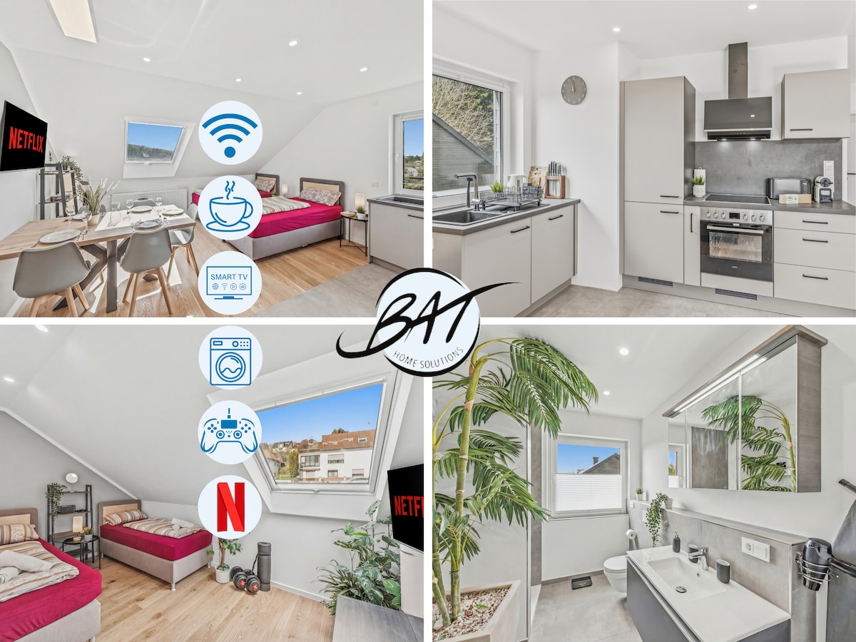 «Apartment Trier» es un apartamento muy luminoso y acogedor en el ático de una casa tranquila, ideal para personas que viajan solas o parejas, ya sean turistas o profesionales. ¡Cocina totalmente equipada! ¡Baño separado con ducha y WC, solo suelo de parqué y baldosas! Ubicación óptima desde el punto de vista del transporte, ya sea a pie (15 min) o en autobús directamente al casco antiguo. Conexión de autobús a la universidad en las inmediaciones, así como tres supermercados y una cafetería.
