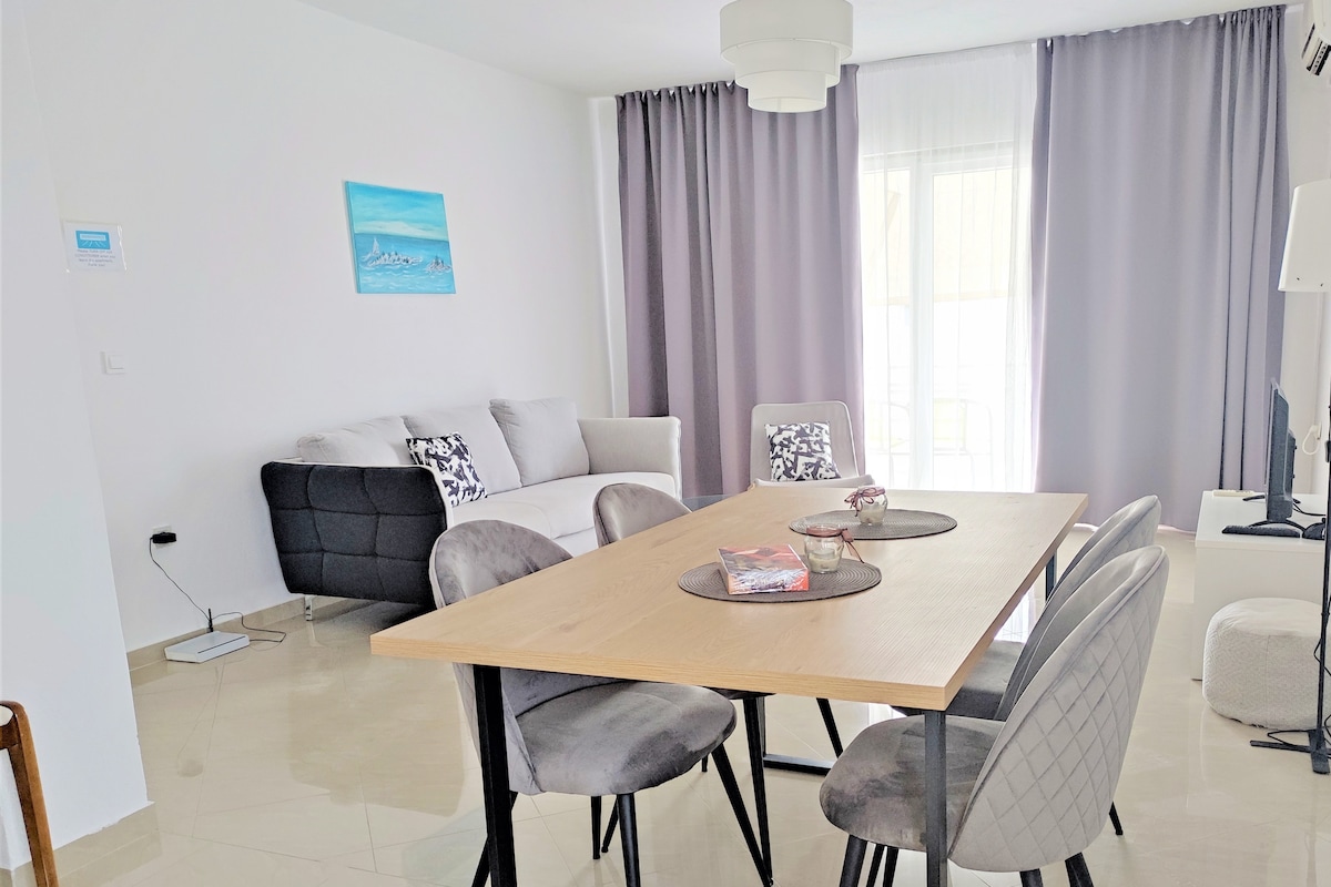 Muy bonito apartamento para 4 personas en una ubicación perfecta. Dos dormitorios, dos baños, TV inteligente, internet de alta velocidad, cocina totalmente equipada. Dos balcones con vistas al mar (desde cada habitación). Entorno relajante y tranquilo. La casa está situada directamente en la playa, rodeada de un pequeño parque. Plaza de aparcamiento asegurada en el patio trasero. Hay una piscina muy bonita en el jardín donde podrás disfrutar nadando y relajándote en ella. Un montón de cómodas sillas de playa y protectores solares para todos los huéspedes.