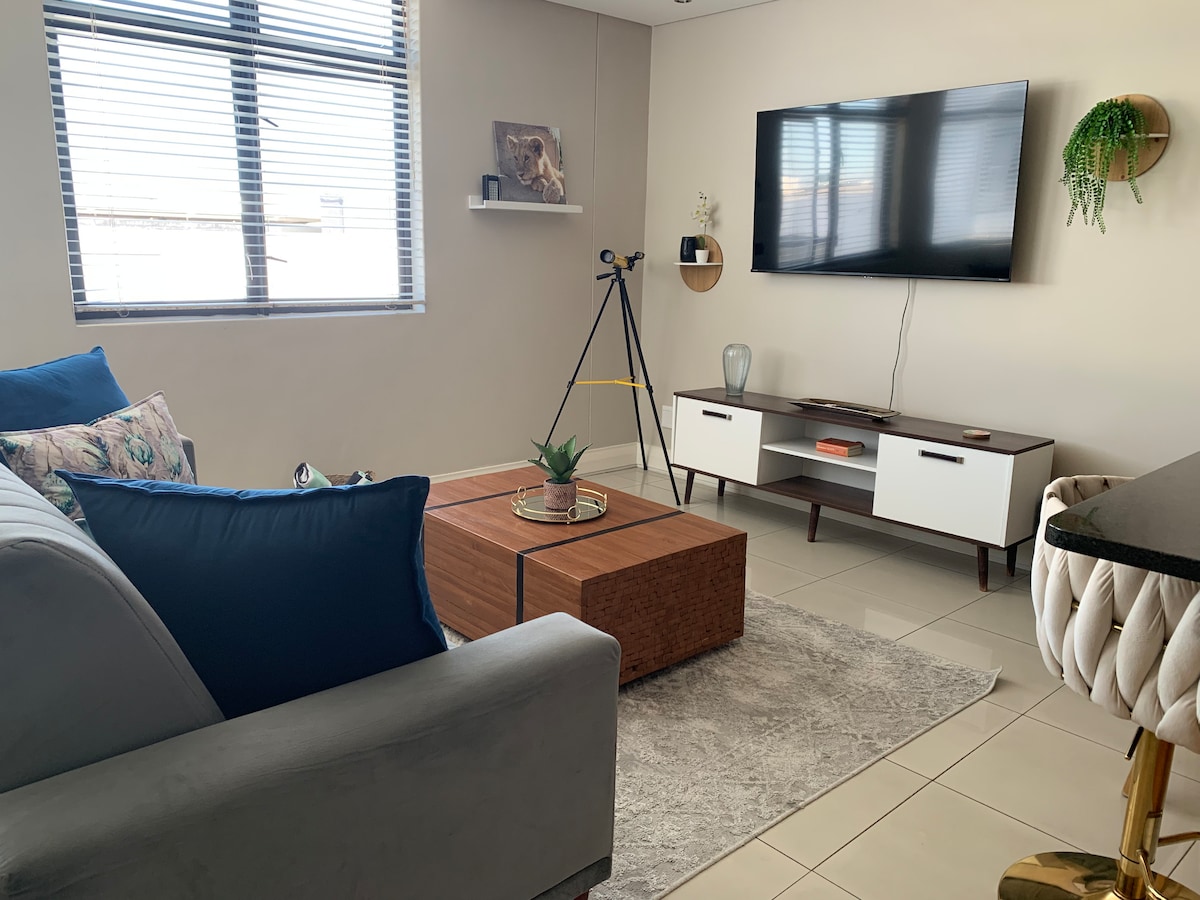 Energía de respaldo disponible. (Más detalles a continuación) Relájate en el balcón y disfruta de las espectaculares puestas de sol del océano y de las impresionantes vistas de la montaña de la Mesa y la isla Robben. A veces incluso pasan grupos de delfines y ballenas. Este lujoso apartamento se encuentra en un complejo muy seguro y a solo 20 metros de la famosa playa de Kite. Aquí podrás darte un capricho con un delicioso helado, relajarte durante una tarde o practicar varios deportes acuáticos (kitesurf, surf, etc.).
