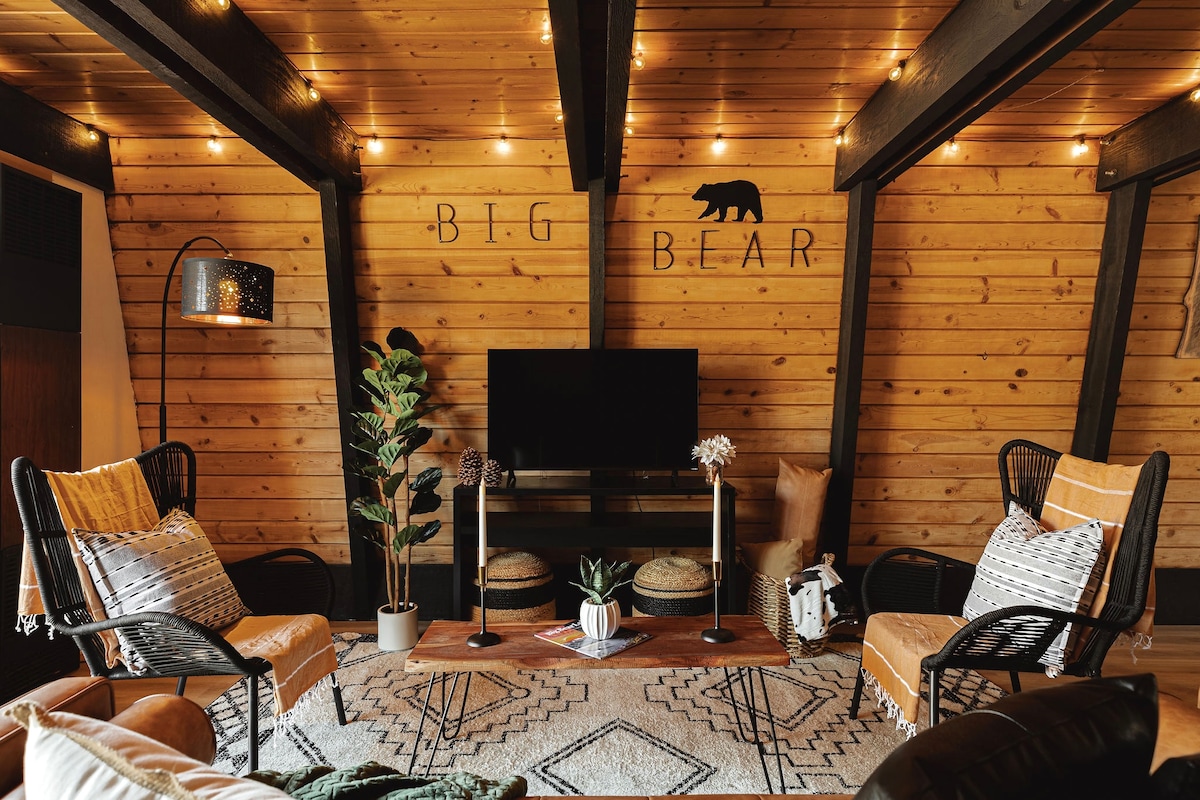Atraviesa una puerta con marco de madera en forma de A para adentrarte en esta encantadora cabaña de estilo serrano con techos abovedados con vigas de madera y ventanas tragaluz. Siéntate a desayunar en una mesa de madera en bruto, luego siéntate en un sofá diván y toca una melodía folclórica en la guitarra acústica. - Ubicada justo entre Bear Mountain y Snow Summit Ski Resorts (¡algunos de nuestros vecinos incluso caminan hasta las pistas!) - ¡Muy cerca del lago Big Bear! - ¡A pocos minutos de los restaurantes y tiendas de la encantadora y animada Big Bear Village! - ¡Barrio tranquilo con rutas locales de senderismo y ciclismo para los entusiastas del aire libre (el Bosque Nacional está a un paso de distancia)! - ¡A tiro de piedra del campo de golf Bear Mountain, así como del zoológico alpino Big Bear! - ¡Parrilla exterior incorporada, casa de juegos para niños, columpio de madera y chimenea ubicada en el patio trasero! - ¡Películas, juegos de mesa, discos de vinilo antiguos, tocadiscos y guitarra proporcionan el entretenimiento! - Capacidad para 4 personas cómodamente con una entrada para 2 coches. - Síguenos en Instagram: @yemodernrustic. ¡Etiquétanos en tus aventuras en Big Bear! Ye Modern Rustic es apto para familias y para un máximo de cuatro huéspedes que buscan una experiencia cálida y acogedora en Big Bear. La decoración es rústica moderna y está destinada a maximizar la comodidad, la amplitud y la funcionalidad. La cabaña tiene poco menos de 900 pies cuadrados, por lo que tendrás mucho espacio para relajarte. Ubicada entre las dos estaciones de esquí locales de primera categoría y a poca distancia en coche de Big Bear Village, te resultará difícil encontrar un lugar más céntrico. Ya sea que pases un largo día en las pistas, senderos locales, campo de golf o lago, ten la seguridad de que volverás a casa a una cabaña equipada con comodidades modernas que están diseñadas para permitir una noche relajante frente a la chimenea o afuera bajo las estrellas haciendo s'mores. Ideal para familias: Ye Modern Rustic es una cabaña familiar. Además de nuestra proximidad a las pistas, el lago, las rutas de senderismo y el zoológico, hay un gran espacio de entretenimiento en la sala de estar. Haz que los adultos o los niños vean una película de nuestra amplia biblioteca de DVD y Blu Ray (¡tenemos títulos para todas las edades!). Para los aventureros al aire libre, haz que los niños se aventuren afuera para usar su imaginación en la casa de juegos convertida ubicada en nuestro patio trasero (visible desde la cocina). La cabaña también está equipada con lavadora y secadora para los pequeños accidentes de la vida. Cocina: Si una comida fuera en la ciudad te parece agotadora, tendrás la flexibilidad de quedarte y cocinar. Nuestra cocina está equipada con ollas, sartenes, platos, cristalería y utensilios. Si no estás seguro de lo que podríamos tener, pregúntanos. Además de nuestra parrilla de barbacoa al aire libre de acero inoxidable incorporada, ofrecemos cafetera, tostadora, microondas y nevera. ¡Nuestra estufa de gas te permite preparar una comida para todo el equipo! Chimenea: La chimenea de leña es totalmente funcional y te mantendrá caliente en las noches más frías. Coge un poco de leña de una gasolinera local o de una tienda de comestibles (puedes encontrarla en cualquier lugar) y disfruta de una noche frente al fuego. ¡Nuestro personal de limpieza se encargará de las cenizas, así que no tendrás que limpiar! Dormitorios: El dormitorio principal contiene una cama tamaño queen, mientras que el segundo dormitorio tiene una litera con un colchón individual en la parte superior y un colchón completo en la parte inferior. Todos los colchones están equipados con cómodas sábanas, ropa de cama y fundas de almohadas. Nuestro equipo de limpieza lavará la ropa de cama cuando te vayas, así que no tendrás que limpiar. Ambos dormitorios cuentan con ventiladores de techo, así como armarios vacíos y aparadores que permiten un amplio almacenamiento en estancias más largas. ¡Deshaz las maletas y quédate un tiempo! Baño: El baño compartido se ha actualizado con buen gusto con accesorios modernos y suelos de baldosas nuevos. Hay un calentador de techo temporizado para ayudarte a pasar las mañanas de invierno más frías. Hay toallas limpias disponibles para todos, además de un amplio suministro de papel higiénico, champú, acondicionador y gel de baño. Entretenimiento/wifi: Nuestra cabaña está habilitada para wifi, por lo que, además de elegir entre nuestra biblioteca de títulos de películas, nuestro gran reproductor de HDTV/Blu Ray es compatible con Netflix, HBOGo y Hulu (tendrás que iniciar sesión con tu cuenta). Juegos de mesa clásicos (Monopoly, LIFE, Sorry!, Operation, Uno y más) están disponibles y permiten pasar una noche divertida con amigos o familiares. Prueba nuestra colección de discos de vinilo vintage seleccionados mientras disfrutas de una noche de juegos o una acogedora conversación junto al fuego. ¡Pon algunas canciones de fogata o coge nuestra guitarra acústica y escribe la tuya! Patio trasero: Nuestro patio contiene una nueva parrilla de barbacoa de 4 quemadores incorporada (las herramientas para asar están disponibles en los armarios de la cocina), además de un columpio de madera y un pozo para el fuego. ¡Rodéate de altos pinos, haz s'mores y relájate con una noche tranquila bajo las estrellas! Mantén a los niños ocupados con una casa de juegos amueblada con una cocina de juegos y un juego de médicos. Con nuestro soporte de papel de sobremesa (suministramos el rollo de papel de dibujo y los marcadores), ¡pídeles que dibujen una obra maestra inspirada en la naturaleza! Basura: Debido a nuestra ubicación en las montañas y a los animales locales que viven allí, toda la basura debe llevarse al Clean Bear Site en 41970 Garstin Dr, Big Bear Lake, CA 92315. Cada bolsa de basura qu