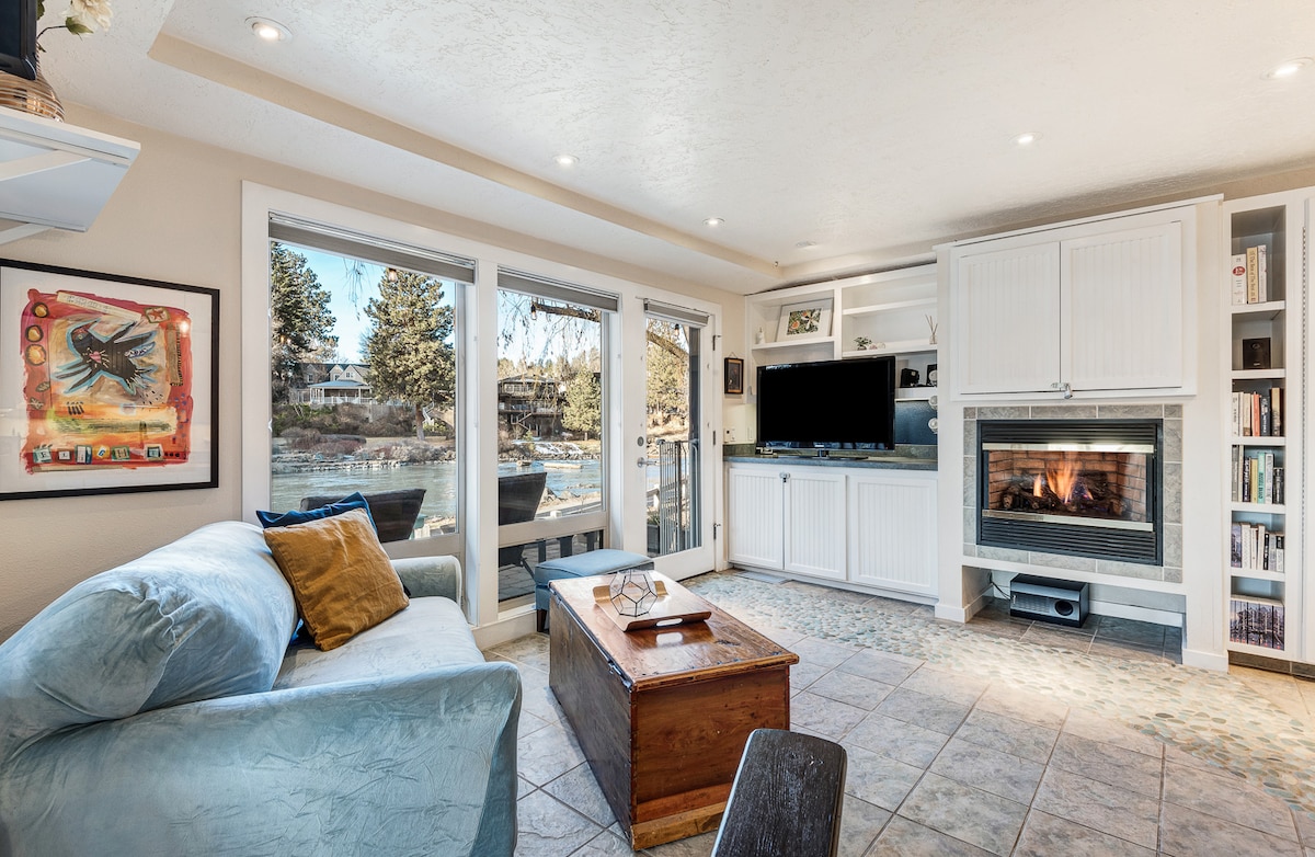 Te damos la bienvenida a "Hot Dam". Hasta tres huéspedes pueden alojarse aquí, en la cama tamaño queen y un sofá cama doble (en la sala de estar). Dispondrás de todo lo necesario para relajarte y disfrutar de la belleza del río Deschutes y del popular sendero Riverfront a través de las ventanas o en tu patio. ¡Disfruta de pisos climatizados, una chimenea, lavandería en la unidad, una enorme ducha a ras de suelo que funciona como sala de vapor, así como acceso a una piscina cubierta y jacuzzi! Trae 2 mascotas por una tarifa adicional.