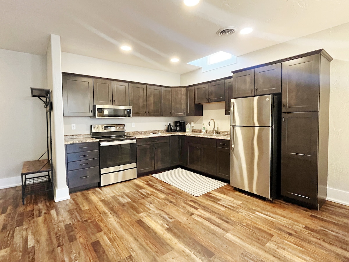 ¡Suite amplia y lujosa en el centro histórico! La cocina, el comedor y la sala de estar completos hacen de esta propiedad renovada un hogar tranquilo lejos de casa. Camina a restaurantes, Moccasin Springs, Evans Plunge y más. COCINA COMPLETA: ¡hemos tenido huéspedes que cocinen su cena de Acción de Gracias aquí! Bien abastecido con cuchillos afilados, tablas de cortar y opciones de café. OFICINA: ideal para trabajar a distancia con wifi rápido y un escritorio dedicado. RELÁJATE: inicia sesión en tus propios servicios de streaming en nuestro televisor de 55pulgadas en la sala de estar.