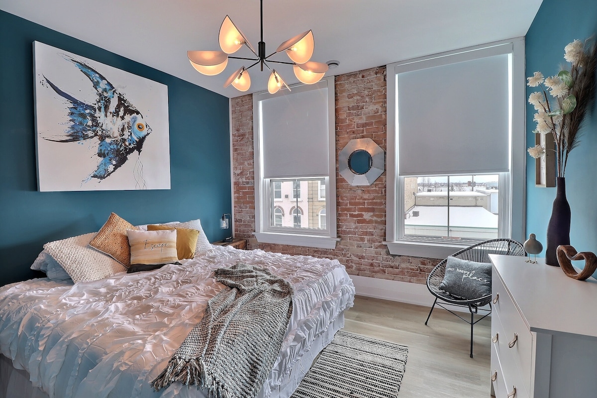 Estadías de media duración de noviembre a junio. Suite de 1 dormitorio de temática náutica, lujosa y romántica. Disfruta de tu propio espacio de 1100 pies cuadrados en el centro de Prescott (a 1 cuadra del río). Con un diseño industrial y moderno, este espacio muestra arte único y personalizado, literatura y vistas parciales al río. NOTA: El acceso a la unidad es solo desde las escaleras exteriores. Este alojamiento está en el tercer nivel y no es recomendable para personas que puedan tener dificultades con las escaleras o las alturas.