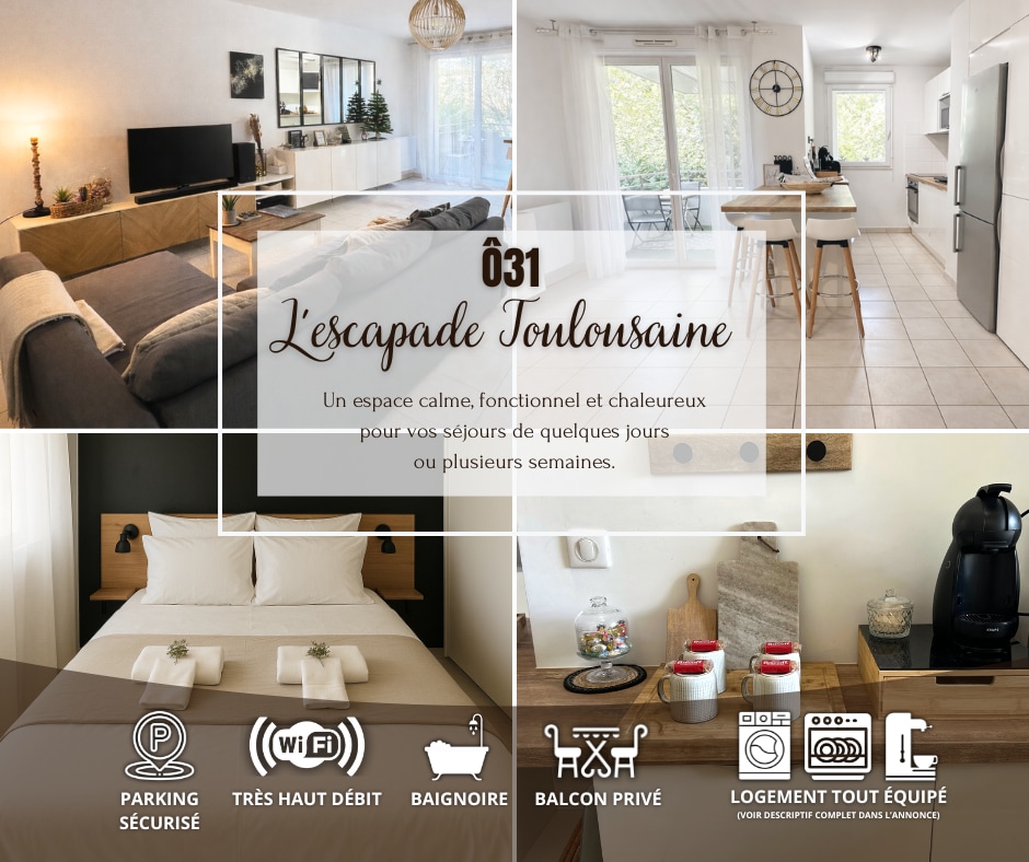 ¡Hola, queridos viajeros! Alquilamos este T2 de 50 m² recién reformado situado en una residencia tranquila. En cuanto a su situación geográfica, estará a: - 700 m de los primeros servicios (Carrefour Market, farmacia, panadería, …) - A 4 km de la clínica Les Cèdres - 6 km del centro de exposiciones «Le MEETT» - a 10 km del aeropuerto de Toulouse Blagnac y del museo Aéroscopia - A 10 km de la gran zona comercial Leclerc Blagnac - a 20 km del centro de Toulouse (estación de Matabiau)