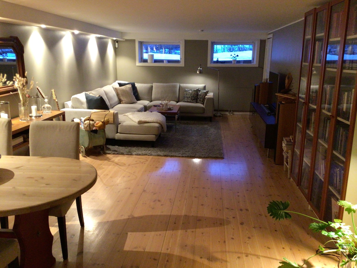 Enjoy a peaceful stay at this tranquil place by the sea. Surrounded by tall pine trees in the base floor of our architecht drawn house. Everything you need inside, and nature just outside the door. A rocky path leads to the private jetty with a rowing boat at your disposition. Within a 20 minutes drive you will get to Kolsås, Sandvika, Høvikodden and Oslo, and by public transport Oslo is within 1h reach. We also rent out our home during summer: airbnb.com/h/homebetweenthepinesbytheoslofjord