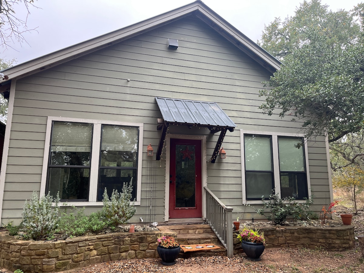 ¡Esta pintoresca casa de huéspedes está cerca de todo! A poca distancia a pie del centro de la ciudad para disfrutar de comida, vino, cerveza, arte y el espectáculo de luces. ¡A poca distancia en coche de Fredericksburg, Dripping Springs, Blanco, Marble Falls, Austin y San Antonio! Un dormitorio con cama tamaño queen y un baño. ¡La cocina completa tiene Keurig, cafetera, ollas y sartenes, horno y nevera para preparar el desayuno o calentar tus sobras! Televisión inteligente, juegos y libros. Sofá de dos plazas y mesa de comedor. Entrada privada con patio y cochera.