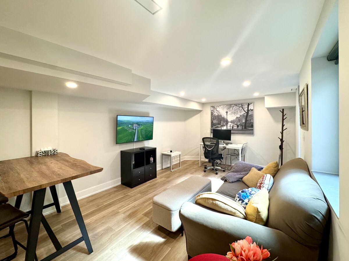Esta es una suite de nivel inferior totalmente privada, que ofrece una estancia luminosa y cómoda. La unidad tiene su propia entrada privada, así como una cocina, baño, lavandería, sala de estar y dormitorio, todo exclusivamente para tu uso. No compartirás ningún espacio con otras personas. Entrada totalmente privada (llegada autónoma a través de una caja de seguridad) y una puerta de seguridad que conduce a la entrada (no un carril expuesto como otras calles de Toronto). Mira las fotos del exterior. Consulta el descargo de responsabilidad en los detalles a continuación.