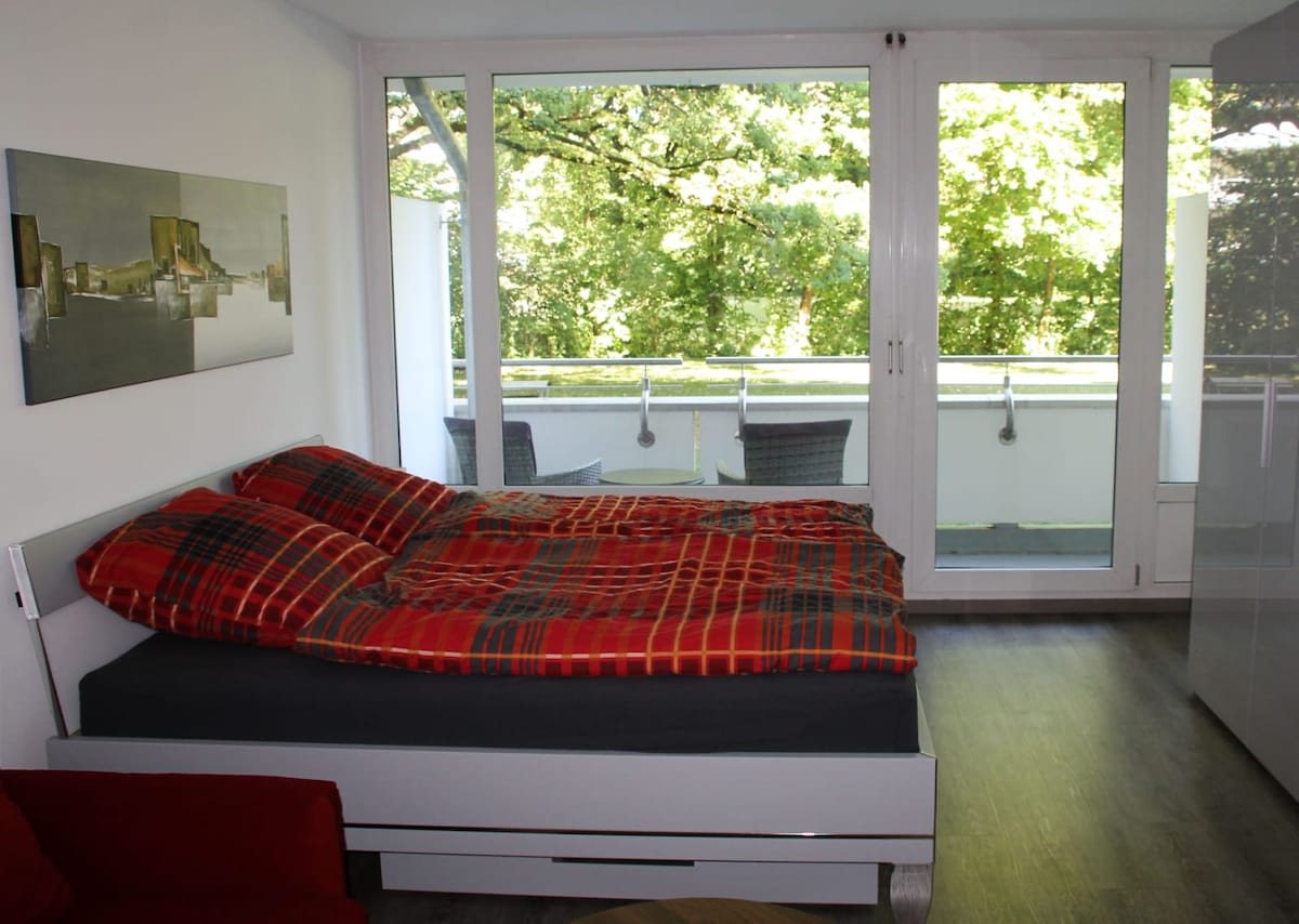 Nuestro apartamento en el sótano en una hermosa ubicación verde con la mejor conexión con el centro de la ciudad, el aeropuerto y la feria puede alojar de 4 a 5 personas. Los dos dormitorios tienen camas grandes y acogedoras. El nuevo y elegante baño tiene una ducha extra grande. La cocina está equipada con todo lo esencial. Todas las habitaciones tienen ventanas, lo que permite que entre aire fresco y mucha luz en el apartamento.