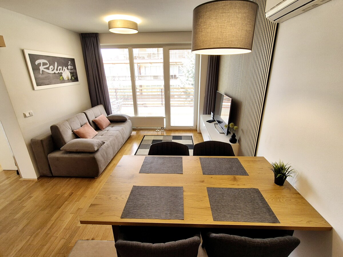 Enjoy at spacious outdoor place in rustic green environment, within walking distance of a large thermal complex and a golf course. This open-space appartment is entirely on the same level (including the shower in the bathroom); the passages between the individual parts are easy to pass also for disabled people. It shares a large yard and the garden with another apartment. Available are a grill and bicycles for wandering along the picturesque cycling trails in the area. Pets are wellcome.
