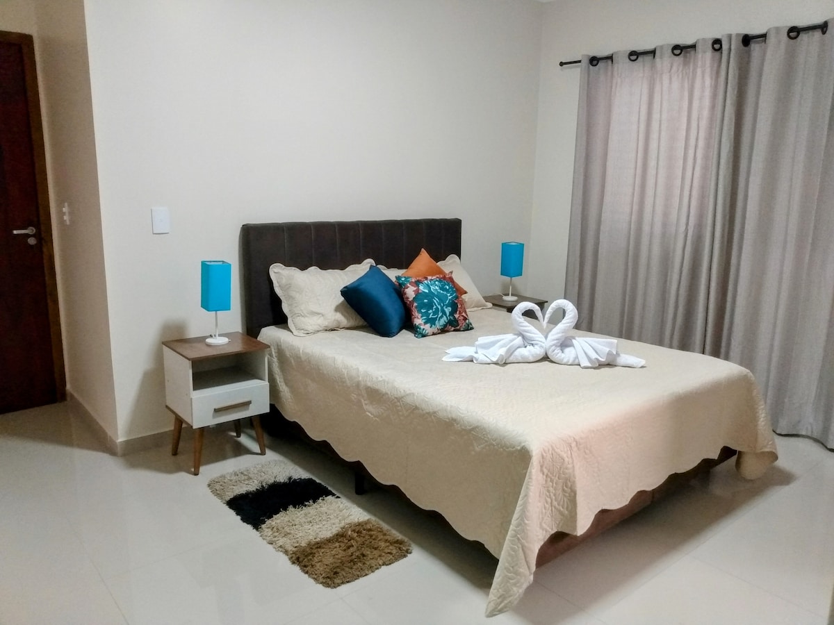 ¡Relájate en esta espaciosa y acogedora casa! Hay cuatro habitaciones que son dos suites, un baño social y un aseo en la zona gourmet. Todas las habitaciones tienen una cama doble, con aire acondicionado frío y caliente, para los otros huéspedes tenemos colchones. ¡Piscina con aire acondicionado durante todo el año! Podemos indicar cocinero y limpiador, para que tu estancia sea aún más práctica y relajante. ¡Le damos la bienvenida a tu mascota! Terreno completamente vallado, sin riesgo de que tu amigo huya. ¡Ven y experimenta momentos especiales!
