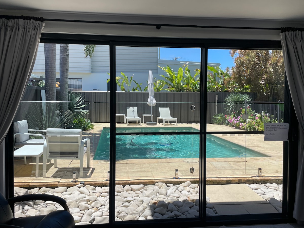 Esta moderna unidad de un dormitorio y un baño es totalmente independiente y tiene vistas a la piscina. Tiene su propio acceso a la puerta principal y acceso independiente a la piscina de USO EXCLUSIVO. Situado a 150 metros a pie de la hermosa playa de Buddina y a 150 metros también del río Mooloolah. También está a un kilómetro de un gran centro comercial con cines y a diez minutos en coche de la icónica Mooloolaba. Al otro lado de la carretera, puedes ir caminando a una selección de cafeterías y restaurantes tailandeses.
