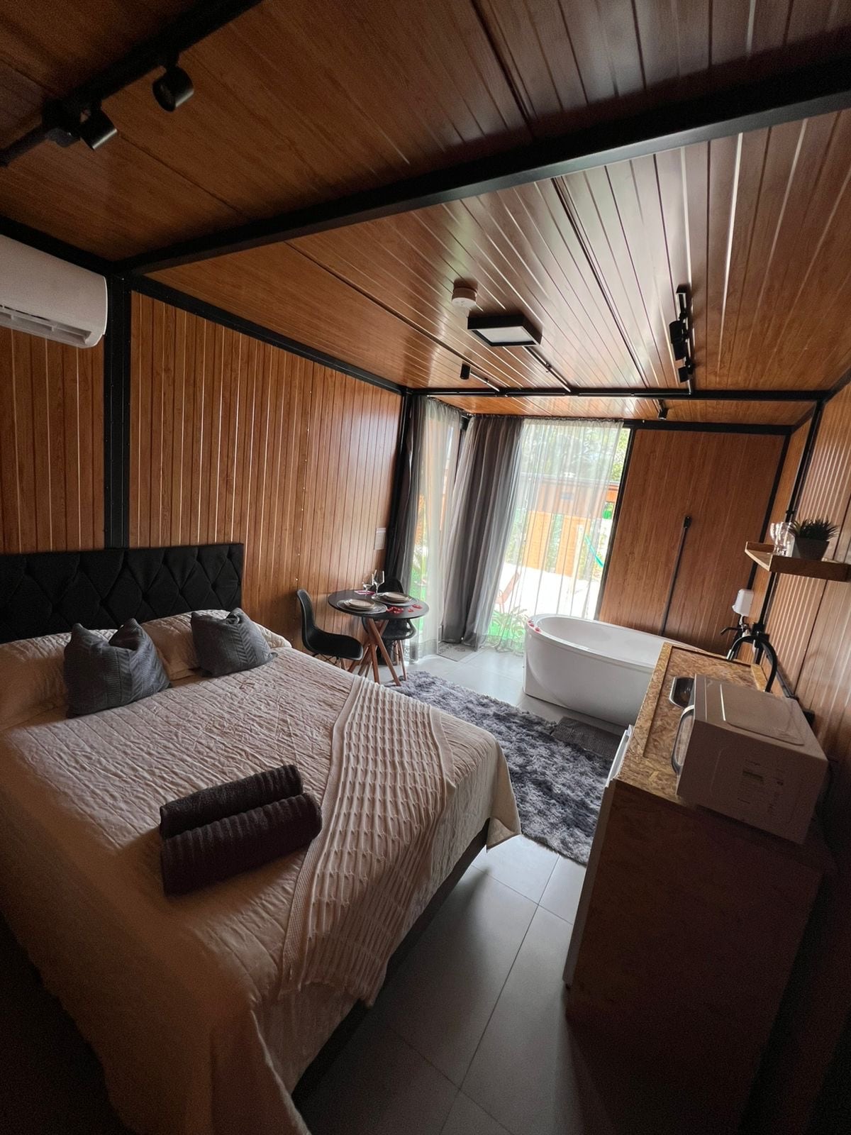 Cabana Guanandi es un refugio con alma, construido a mano con madera de demolición y detalles artísticos. Situada cerca de la montaña y siendo la última casa de la calle, proporciona una verdadera inmersión en la Mata Atlántica, donde es posible observar varias especies de aves y animales salvajes. Es el lugar perfecto para desconectarse del mundo y reconectarse con la naturaleza y con uno mismo. Estamos deseando compartir este lugar de amor.