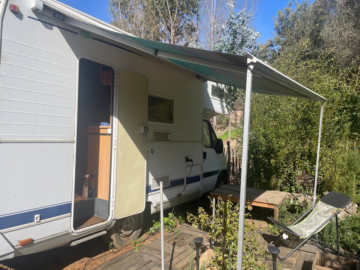 Se aloja en nuestra autocaravana con todas las comodidades para 4 personas Una cama doble grande en capuchina 2 literas (en 70) Le gustará el entorno agradable y tranquilo de nuestro jardín Disfrutas de las instalaciones al aire libre Terraza cubierta con mobiliario de jardín (Mesa, sillones, hamaca) Cocina de verano (Nevera, parrilla, horno de microondas...) Futbolín… Se proporciona ropa de cama Sábanas Toallas En el lugar, verduras del jardín, huevos frescos, pan casero y posibilidad de comida para llevar