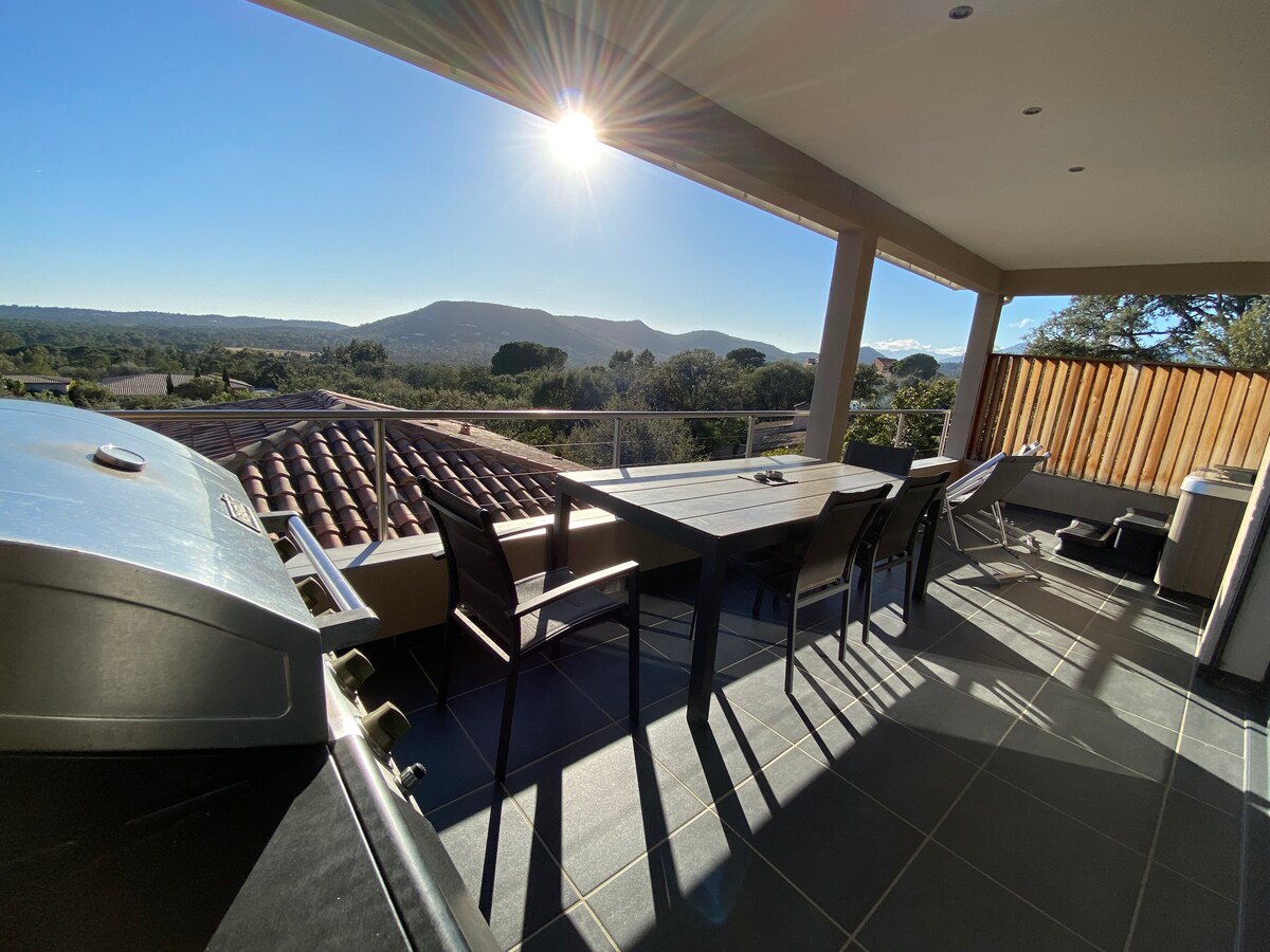 El jacuzzi está en la terraza con una barbacoa, tumbonas y una mesa, todo con vistas al mar. La piscina se calienta a 29 grados desde abril (vacaciones de Semana Santa) hasta principios de noviembre (vacaciones de Todos los Santos). También tiene acceso al baño turco y a la sauna, así como al gimnasio. La playa de Pinarello está a 700 metros a pie con su pequeño pueblo de pescadores y sus restaurantes. El río está a 10 minutos con sus piscinas naturales y rutas de senderismo.