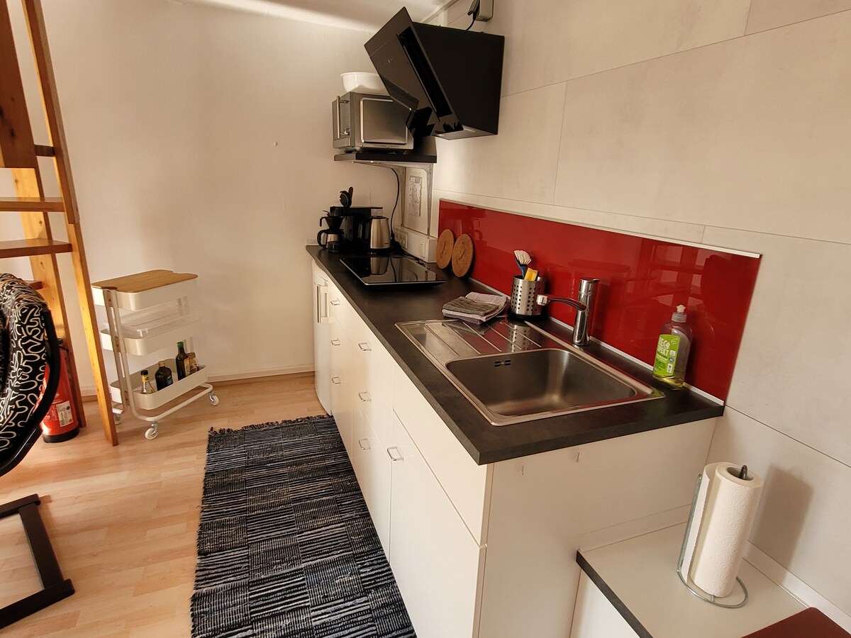 Tiene 40 m² y se encuentra en una casa de 2 familias en las afueras de Lenglern. En la planta superior se encuentran la entrada, el dormitorio y el baño. Una escalera de caracol conduce desde el dormitorio directamente a la sala de estar con una pequeña cocina. Delante se encuentra la pequeña terraza. Aparcamiento público justo delante de la casa. Conexión de transporte público a Göttingen en autobús y tren (el tren llega a la estación de Göttingen en 9 minutos)