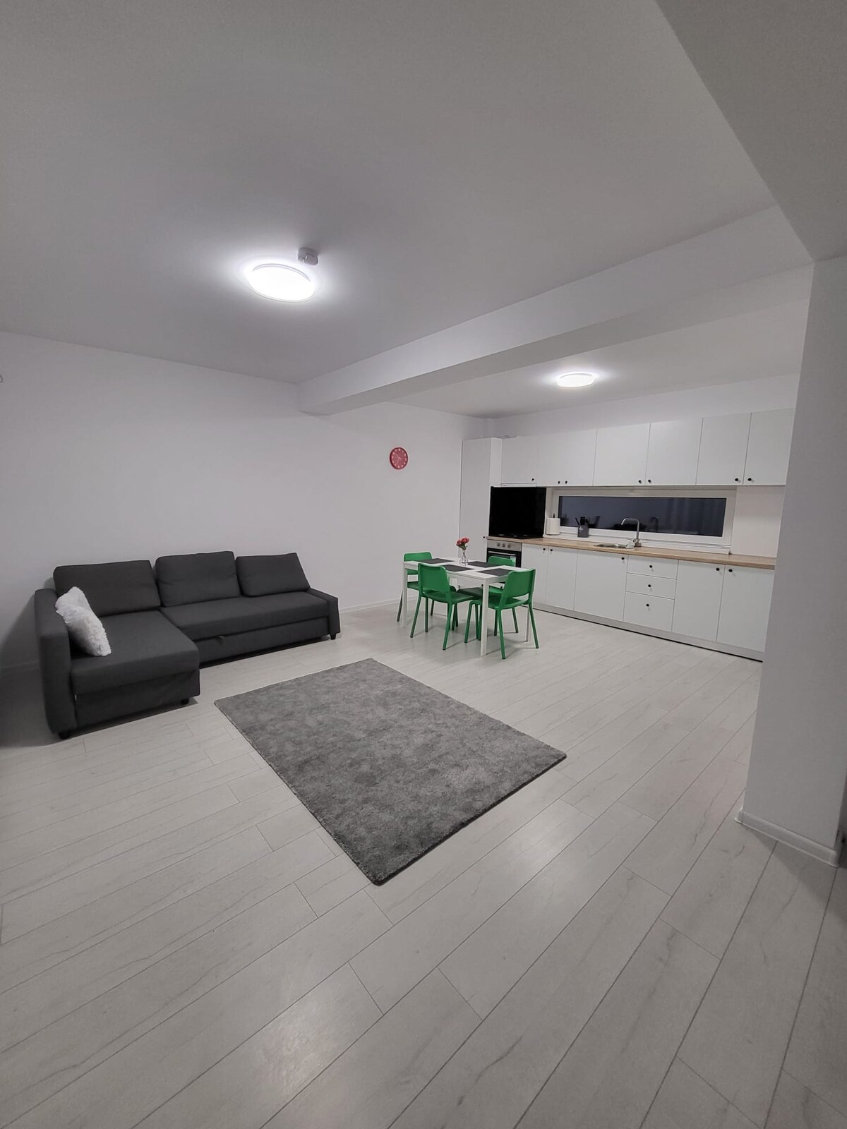 Nuestro departamento, ubicado en el centro de Bragadir, es ideal para viajeros de negocios o aquellos que quieran explorar la zona. Ofrecemos un espacio moderno y funcional, perfecto para sentirse como en casa. La sala de estar tiene un sofá cama, que proporciona un lugar cómodo para relajarse después de un largo día. El dormitorio, con una cama tamaño queen, y el baño con bañera garantizan tu privacidad y comodidad.